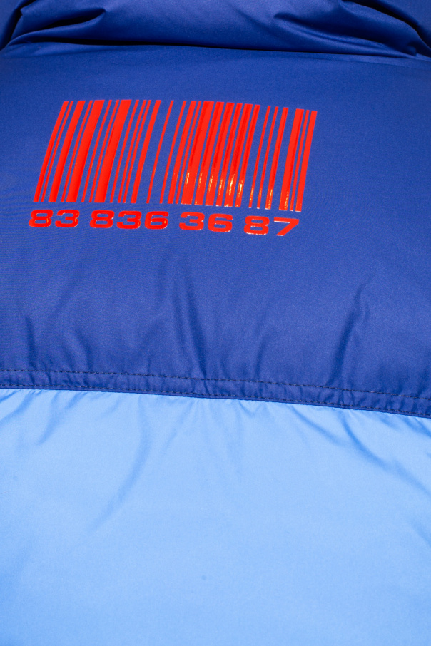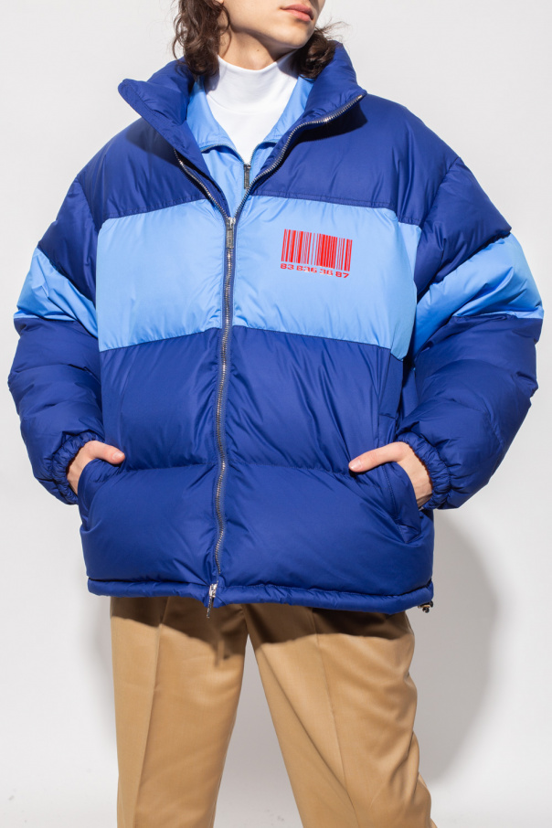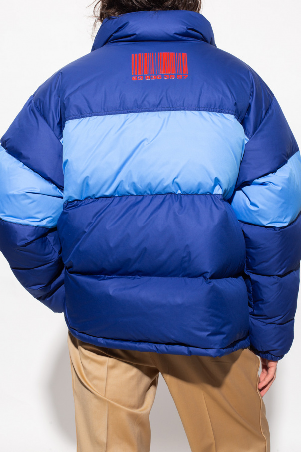 Blue and navy blue down jacket from VTMNTS. Emblazoned with a red graphic theme repeated on the front and back, this style features a zip fastening engraved with the brand\'s signature barcode, two zip pockets, a drawcord-adjustable hem and long sleeves with elasticated cuffs.