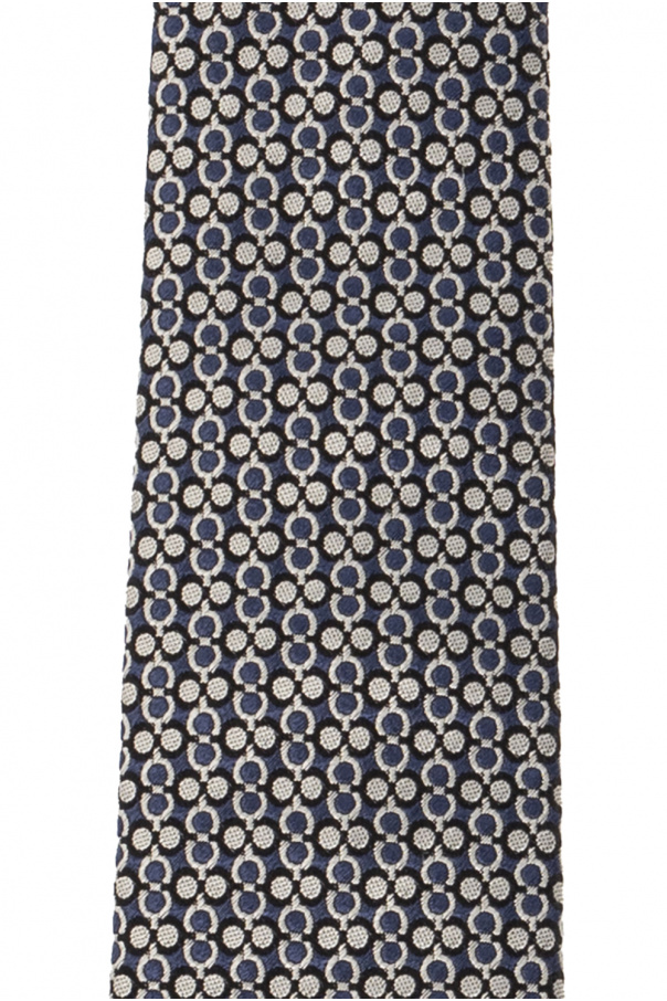 Silver-tone, black and navy blue tie from Salvatore Ferragamo. Made of silk, this item showcases the brand\'s signature Gancini pattern.