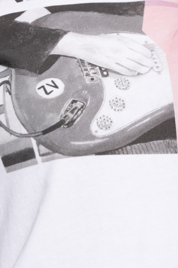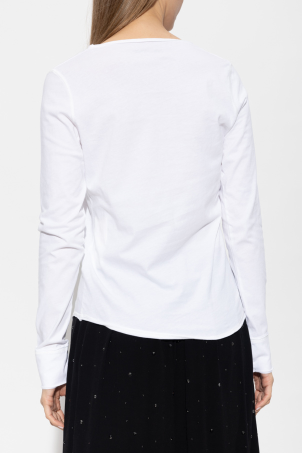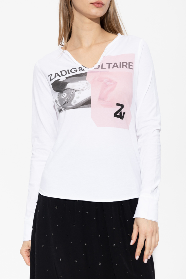 White ‘Cake’ V-neck top from Zadig & Voltaire. Made of organic cotton, this long sleeve design features a printed pattern and sequins inserts.