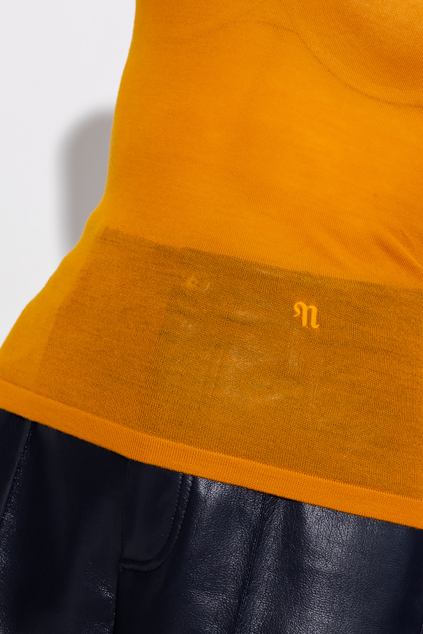 Orange ‘Arti’ sleeveless top from Nanushka. Crafted from wool, this round neck design is decorated with a logo embroidery.
