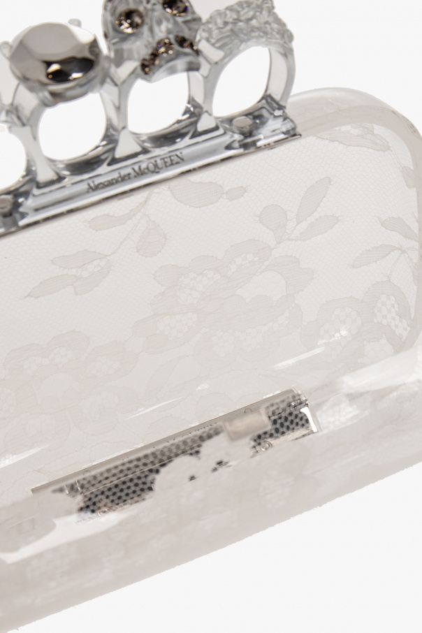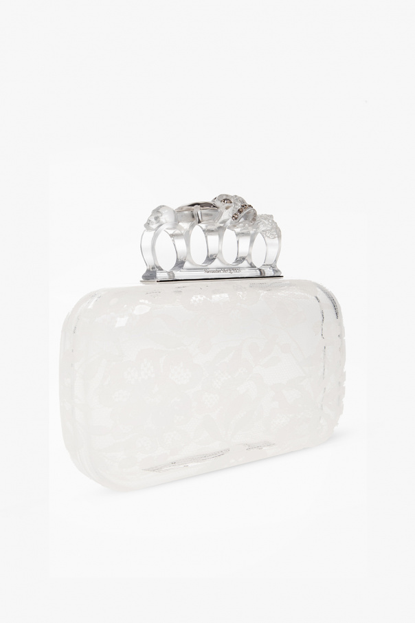 White ‘Skull Four Ring’ handbag from Alexander McQueen. Crafted with a transparent finish and embedded lace, this design secures with a snap and showcases a distinctive ring handle with the brand\'s signature skull bejewelled with glossy Swarovski crystals, and one internal compartment.