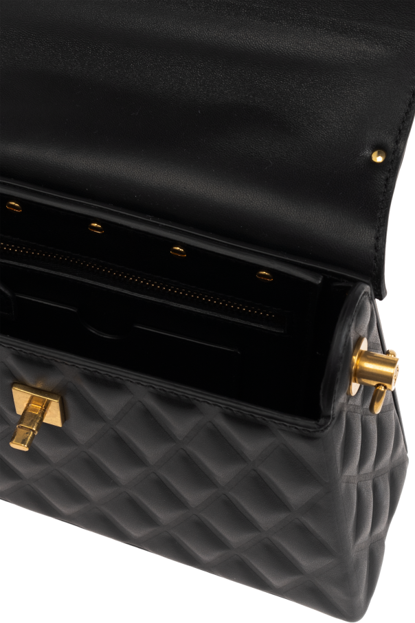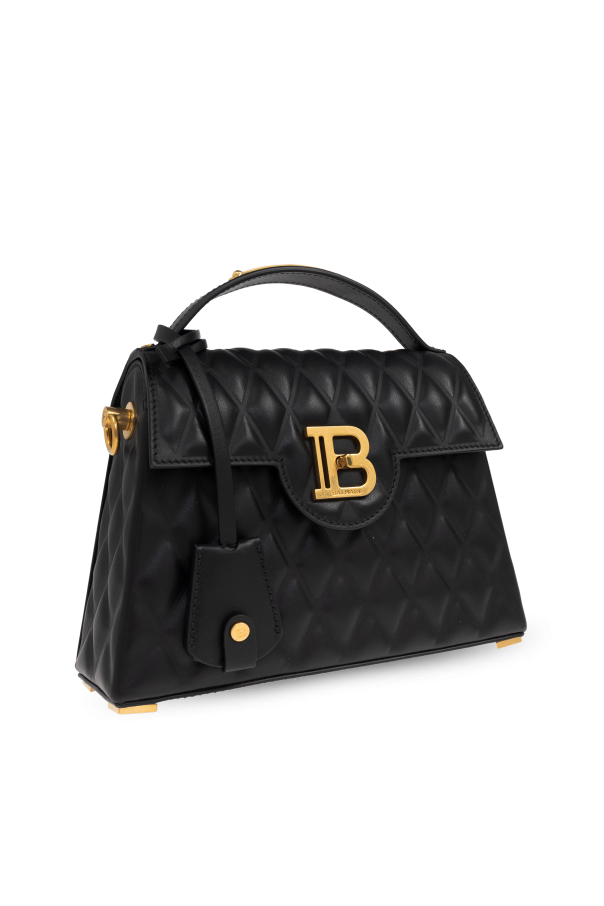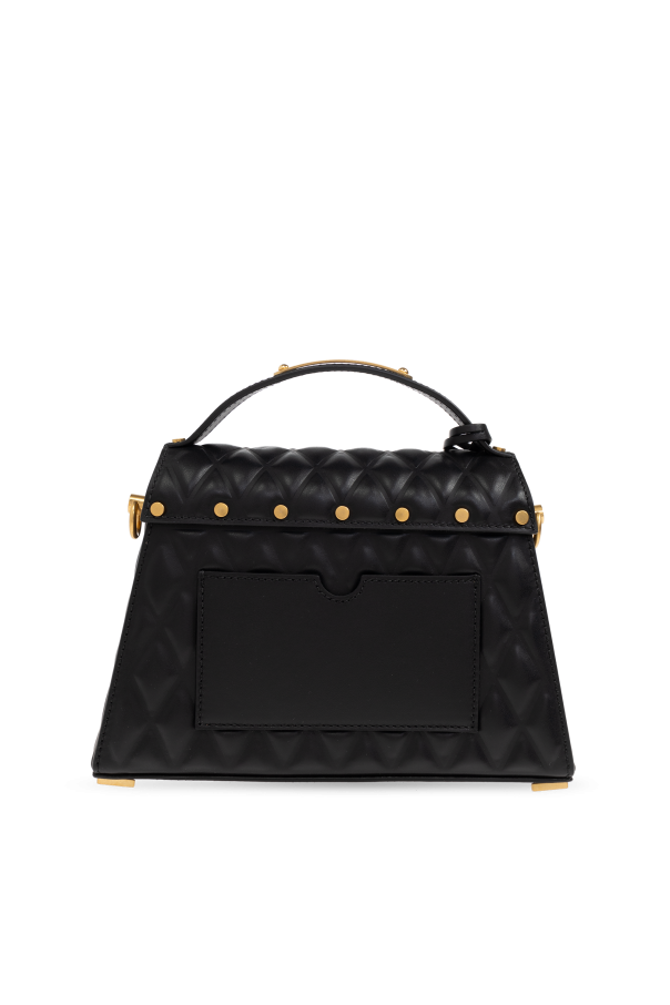 Introducing the B-Buzz Dynasty bag, an epitome of luxury and elegance from the prestigious French house of Balmain. This exquisite handbag boasts a classic trapezoidal silhouette, adorned with quilted diamond patterns that exude sophistication and refinement. Crafted from sumptuous black leather, the bag is accented with opulent gold elements, including the signature “B” logo, closures, rivets, and a buckle on the strap, which infuse a touch of grandeur. The decorative leather charm adds a unique flair. Functionality meets style with a top handle and an adjustable strap for versatile wear. The spacious interior is thoughtfully designed with a main compartment, a zippered pocket, and a card slot for practicality. The twist closure ensures security and ease of access. Its timeless black hue makes it a versatile accessory that complements any ensemble effortlessly. Why Choose This Product? Exquisite design by Balmain, synonymous with haute couture. Luxurious material ensures durability and style. Versatile carrying options with both handle and strap. Spacious interior with organized compartments. Universal black color for seamless styling.