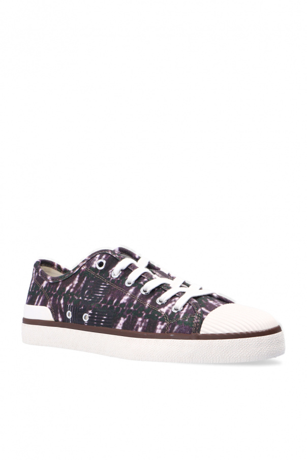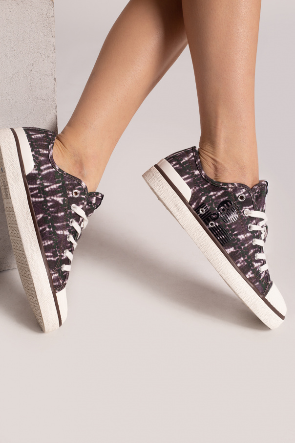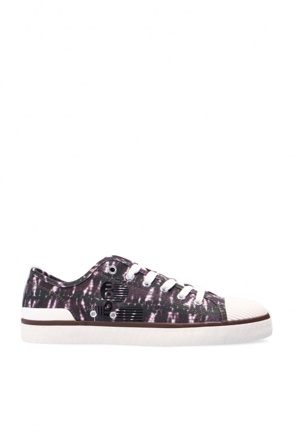 Purple, black and white ‘Binkoo’ sneakers from Isabel Marant. Made of tie-dyed cotton, this lace-up pair sits on a white rubber sole and features a tongue logo patch and a white ribbed rubber toe cap.