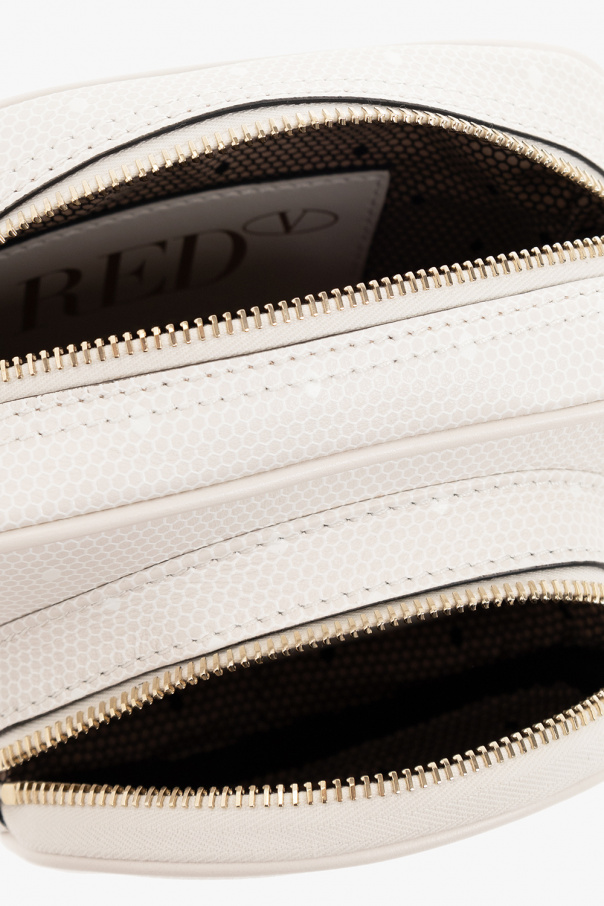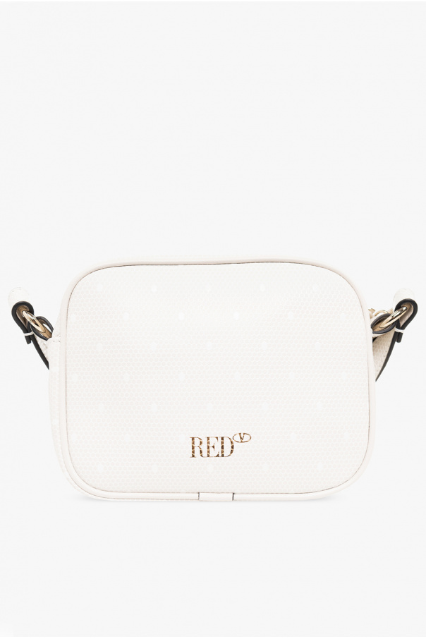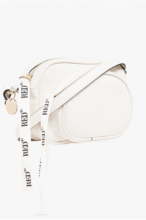 Cream and beige shoulder bag from Red Valentino. Crafted from faux leather, this model fastens with a zip and is decorated with a pattern and logo print. It is complete with a front zip pocket, adjustable shoulder strap, one internal compartment and gold-tone metal hardware.