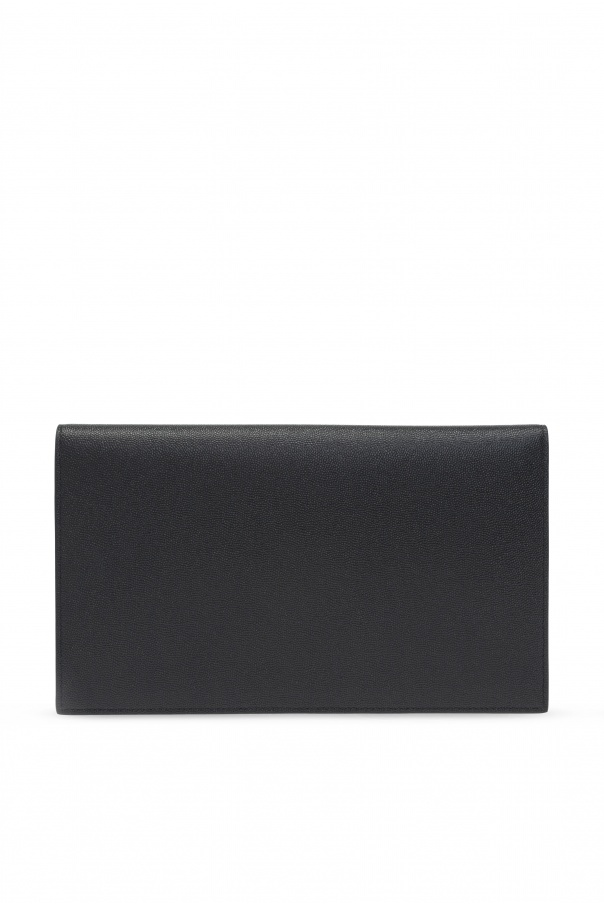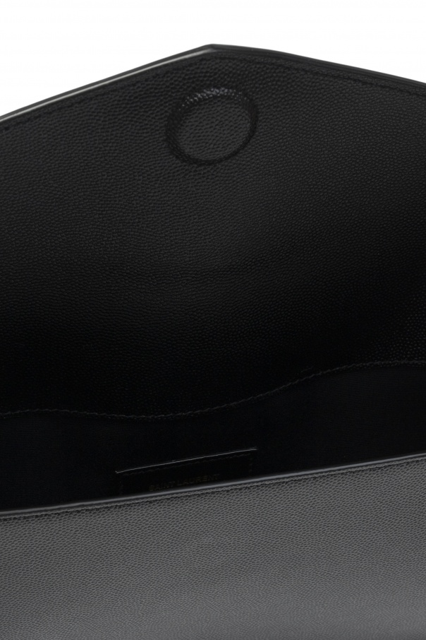 Black ‘Uptown’ clutch from Saint Laurent. Crafted from leather, this item features a snap fastening, gold-tone metal logo appliqué and one internal compartment.