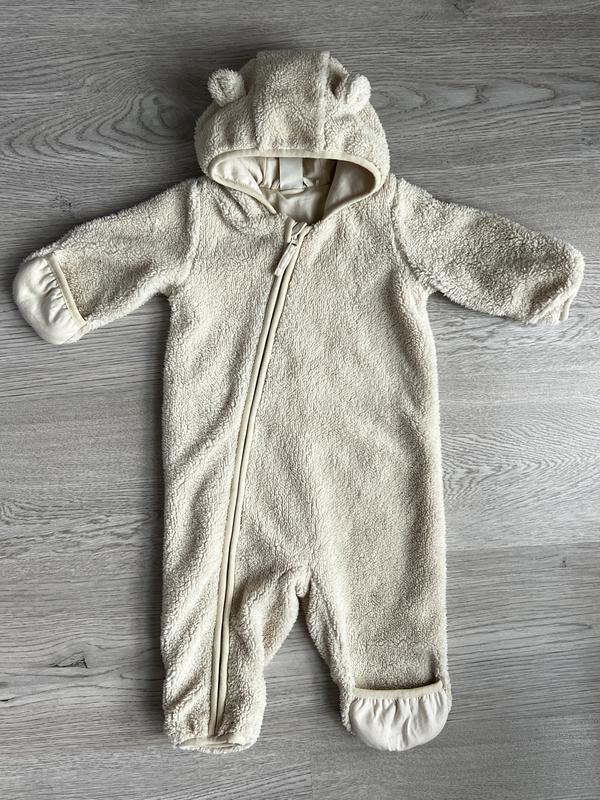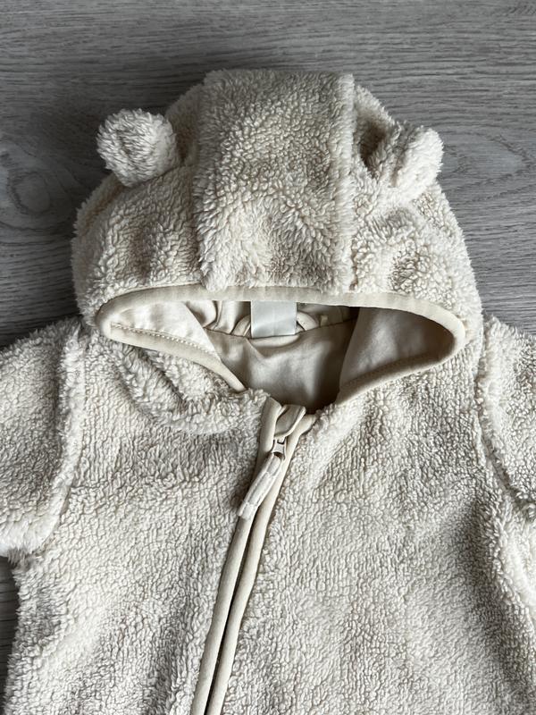 Плюшевый комбинезон с ушками мишки. Очень мягкий и теплый Ножки и ручки закрываются Подкладка коттон Стан идеален, без нюансов На 2-4 месяца Замеры Длина 61 см Рукав 28 см Шаг 21 см