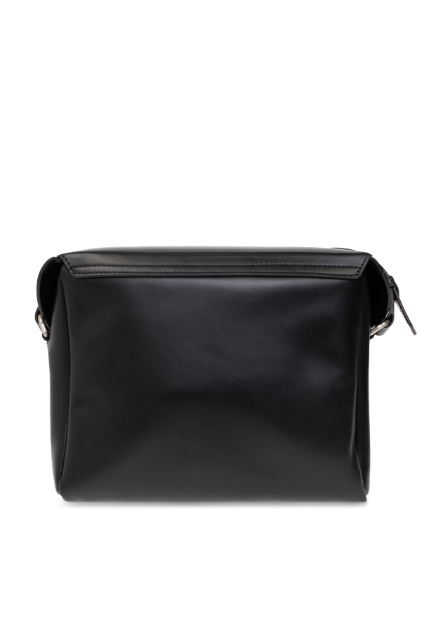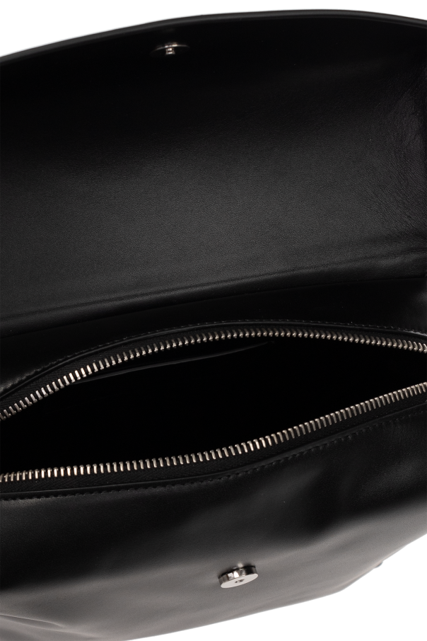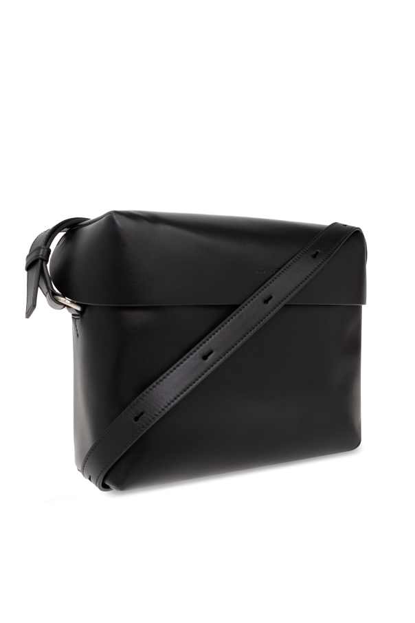 Black shoulder bag from Jil Sander. Made of calf leather, this design secures with a zipper and snap and showcases an embossed logo on the front. It is complete with an adjustable strap, silver-tone metal hardware and one internal compartment with a slip pocket.