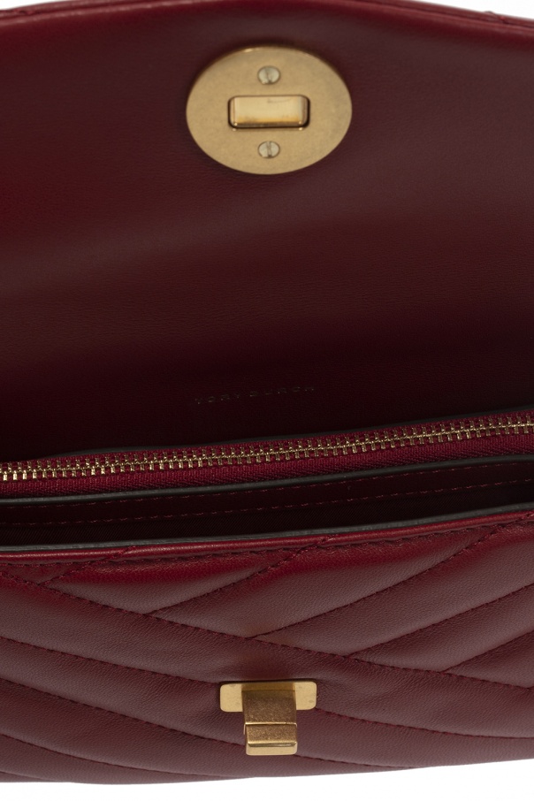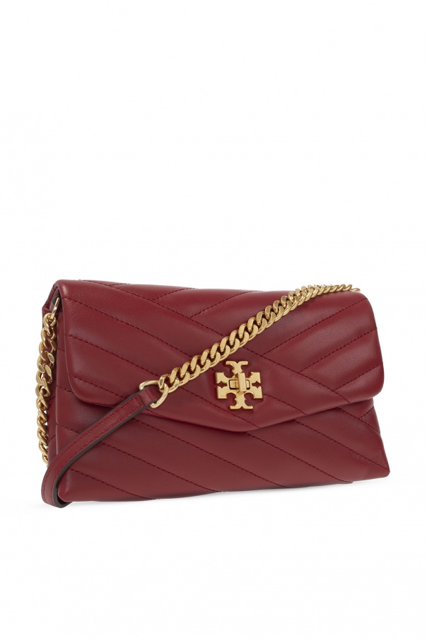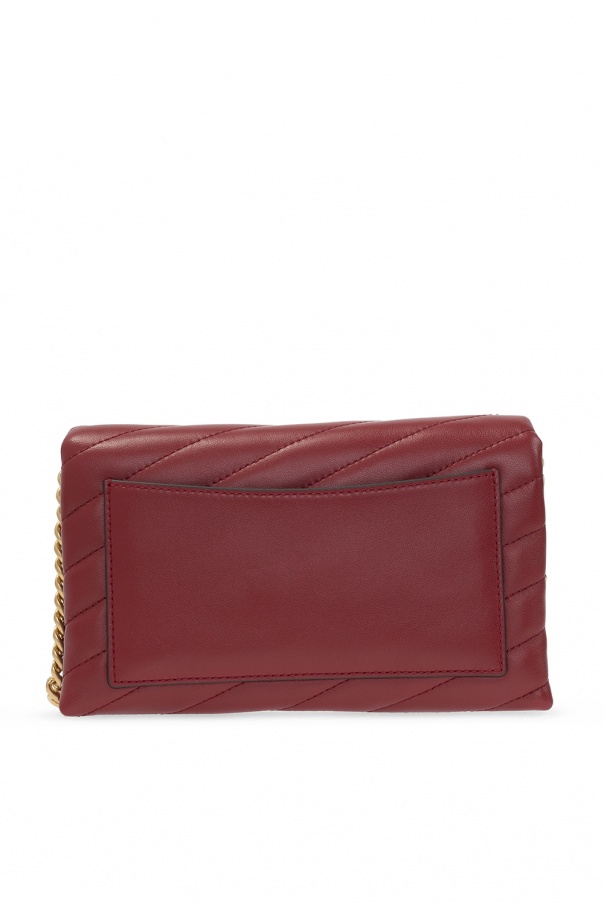 Red ‘Kira’ wallet on a strap from Tory Burch. Crafted from lamb leather, this design features a decorative closure, metal logo on the front, back slip pocket, detachable and adjustable strap braided with a chain, gold-tone metal hardware and two internal compartments, one zip pocket, one slip pocket and six card slots.