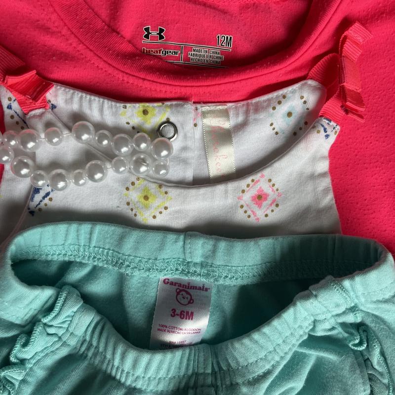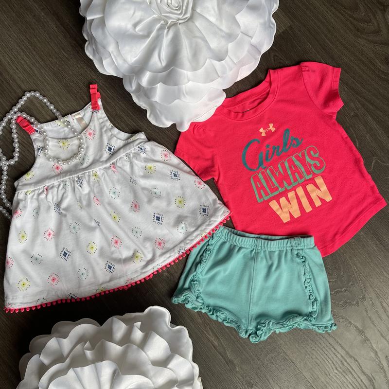 Продам набором комплект брендовых вещей для девочки, которые прекрасно между собой сочетаются Р 🤗 6-9 месяцев (68-74 см) 🛍 3 единицы одежды 👍 стан В лоточку входит: ✔️Платье Cherokee хлопковое, стрейчевое, силуэт трапеция, застежка на кнопках по спинке ✔️Футболка Under Armour, по бирке 12 мес, но маломерит чуточку ✔️Шорты Garanimals хлопковый трикотаж премиального качества, по наборке 3-6, но крупномерят, будут до 9-12 мес При необходимости дам фото с замерами Отправлю любым удобным для вас способом Смотрите другие мои объемы🛍🤗