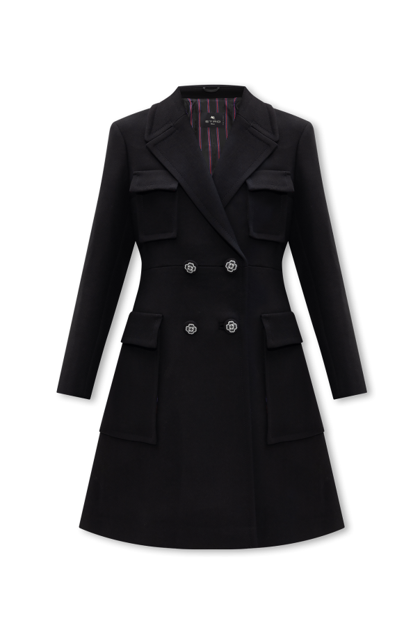 Black coat from Etro. Made of virgin wool with a double-breasted silhouette, this style fastens with decorative buttons with floral embroidery and features a single back vent, notch lapels, four flapped pockets and long sleeves.