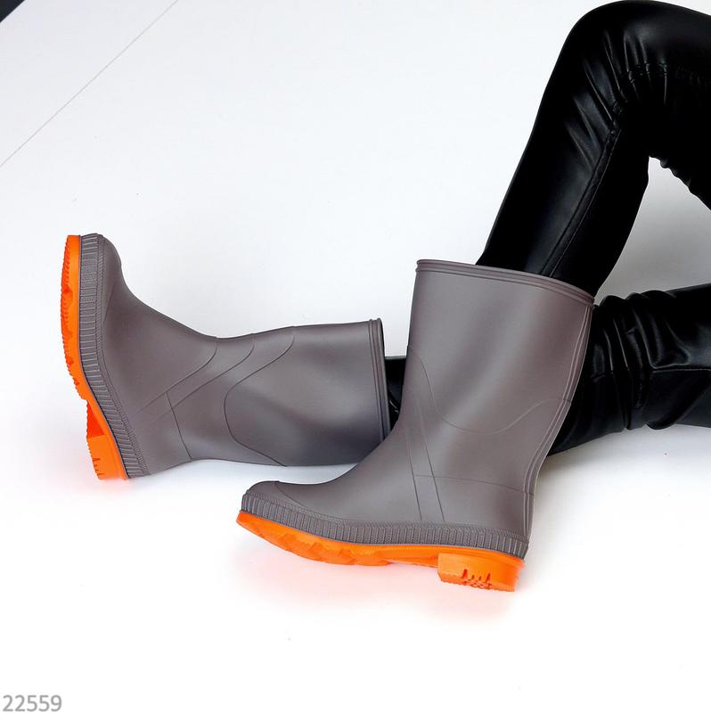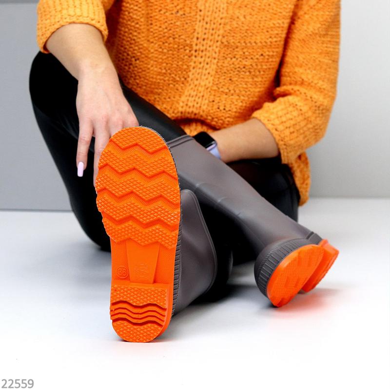 Код 22559 Размеры 36-40 Чоботи для непогоди "Soggy" Материал - Резина Цвет - Серый/Оранжевый, Черный/Фуксия Высота от пятки - 24см Подошва - 3см/1см Замеры прописаны по результатам примерки на стопу На среднюю стопу Размер в размер 36-23,5 37-24 38-24,5 39-25 40-25,5