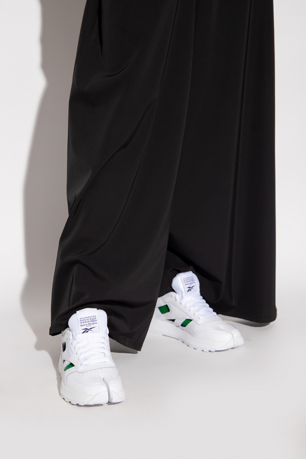 White ‘Project 0 CL DQ’ sneakers from Reebok x Maison Margiela. Crafted from leather, this lace-up model showcases the iconic ‘Tabi’ split-toe design, a branded tongue patch, distinctive cut-out details, perforations and a white rubber sole.