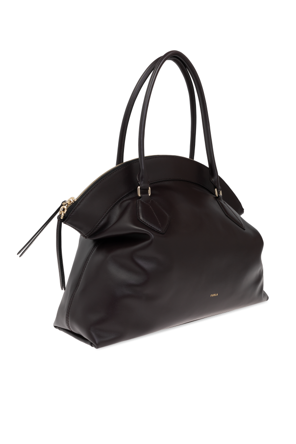 Introducing the Erica XL, an exquisite shoulder bag by the renowned Italian brand, Furla. This luxurious piece is meticulously crafted from smooth, high-quality leather in a deep, rich dark brown hue, exuding timeless elegance and sophistication. The bag\'s rounded silhouette, complemented by its wide base, ensures ample capacity, making it an ideal companion for everyday endeavors. Featuring long, dual handles, the Erica XL offers comfortable shoulder wear. The bag secures your essentials with a sleek, dual zipper closure, while the gracefully embossed golden Furla logo subtly adorns the front, adding a touch of opulence. Inside, the dark-toned lining accentuates the bag\'s luxurious appeal, housing a spacious compartment, a zippered pocket, and two slip pockets for organized storage. Every stitch and golden metal detail is a testament to Furla\'s commitment to impeccable craftsmanship. Why Choose This Product? Crafted from premium smooth leather that ensures durability and elegance. Spacious design with a wide base for enhanced capacity. Secure dual zipper closure for peace of mind. Refined gold-tone details and logo for a luxurious finish. Versatile dark brown color that complements any wardrobe.