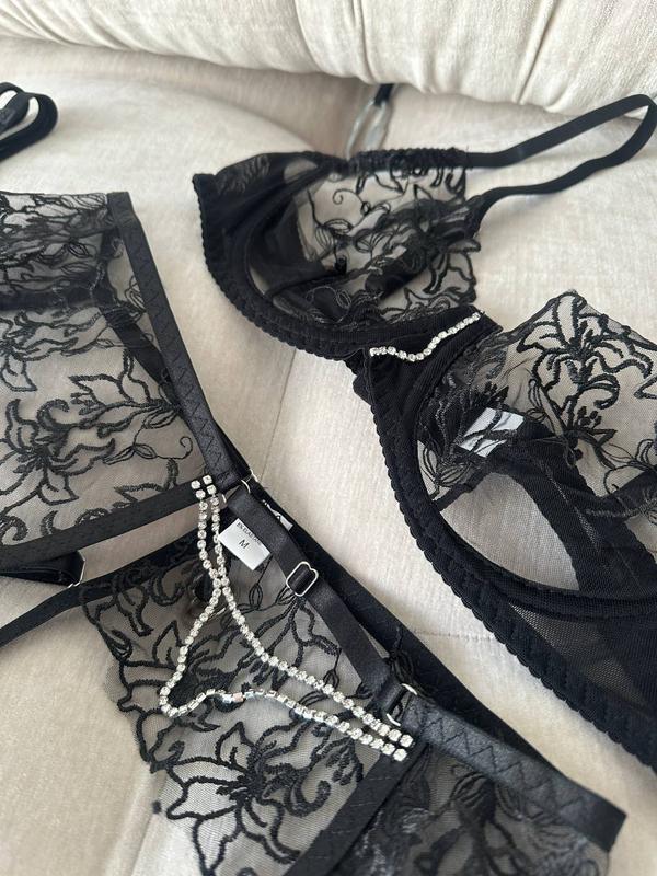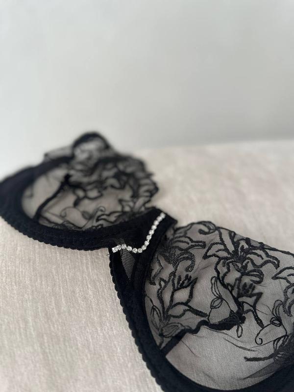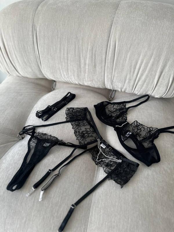🔥ОТРИМАЛИ🔥 Кружевное сетчатое нижнее белье, выполненное из отборных тканей, легкая и дышащая, мягкая, прилегает к телу и обеспечивает вам лучший комфорт. Бюст застегивается на два крючка, шлейки регулируются, декорирован камушками между грудью. Пояс имеет регуляторы и съемный декор с камушками, а также гартеры. Трусики - кружевные стринги с регуляторами. ◾️Модель 800 ◾️Размер: - S маркировка 70-75ВС, трусики ОБ 85-95 см - М маркировки 80-85ВС, трусики ОБ 90-100 см ✔️Цена 820 грн