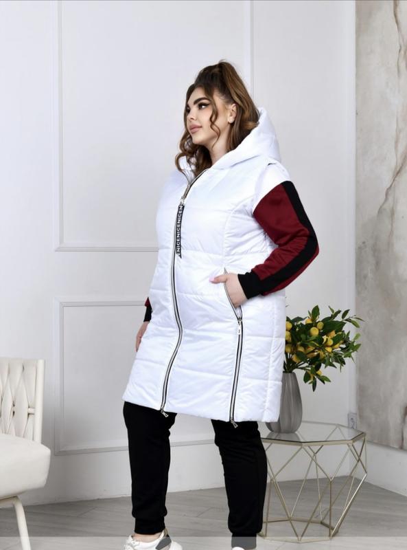 МАТЕРИАЛ: Жилет: плащевка на синтепоне 150 грм2, подкладка; Костюм: трикотаж двонитка РАСТЯЖНОСТЬ: Средняя растяжимость (2-4см) 🌈ЦВЕТ: розовый -белый, лайм-белый, черный -лайм, белый - марсала, черный -марсала, оливка-черный, фреза -синий, лаванда -белый, лаванда -синий Этот костюм из трикотажа двухнитки - идеальный выбор для комфортного и стильного наряда в любое время года. Кофта с капюшоном и люверсами обеспечивает удобство и мягкость, благодаря высококачественному материалу. Ориентировочные замеры готового изделия: ☑️Жилет : 50-52 р-р: длина жилета 96см, ОГ - 120см, ОТ - 120см, ОБ - 126см. 54-56 р-р: длина жилета 98см, ОГ - 128см, ОТ - 128см, ОБ - 134см. 58-60 р-р: довжина жилета 100см, ОГ - 136см, ОТ - 136см, ОС - 142см. 62-64 р-р: довжина жилета 102см, ОГ - 144см, ОТ - 144см, ОС - 150см. ☑️Кофта: 50-52 р-р: длина изделия: 70см, обхват рукава 38см, длина рукава от горловины 75см, ОГ - 112см, ОТ - 110см, OC - 110см. 54-56 р-р: длина изделия: 71см, обхват рукава 40см, длина рукава от горловины 76см, ОГ - 120см, ОТ - 118см, OC - 118см. 58-60 р-р: длина изделия: 72см, обхват рукава 42см, длина рукава от горловины 77см, ОГ - 128см, ОТ - 126см, OC - 126см. 62-64 р-р: длина изделия: 73см, обхват рукава 44см, длина рукава от горловины 78см, ОГ - 136см, ОТ - 134см, OC - 134см. ☑️Брюки: 50-52 р-р: длина брюк по внутреннему шву 73см, длина брюк по внешнему шву с учетом пояса 103см, ОТ - 78/110см, OC -112см. 54-56 р-р: длина брюк по внутреннему шву 73см, длина брюк по внешнему шву с учетом пояса 104см, ОТ - 86/118см, OC -120см. 58-60 р-р: длина брюк по внутреннему шву 73см, длина брюк по внешнему шву с учетом пояса 105см, ОТ - 94/126см, OC -128см. 62-64 р-р: длина брюк по внутреннему шву 73см, длина брюк по внешнему шву с учетом пояса 106см, ОТ - 102/134см, OC -136см. ❗Цены могут отличаться, потому что курс стремительно растет 😔 Благодареннее за понимание 💛💙 🔹Оплата на картку ПриватБанку, Монобанку 🔹Нова пошта, Укрпошта 🔹Обмен и возврат С радостью ответь на ваши вопросы, дам подобрать размер🌷 8 337