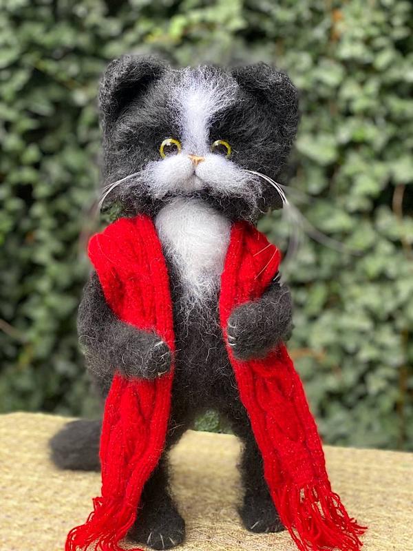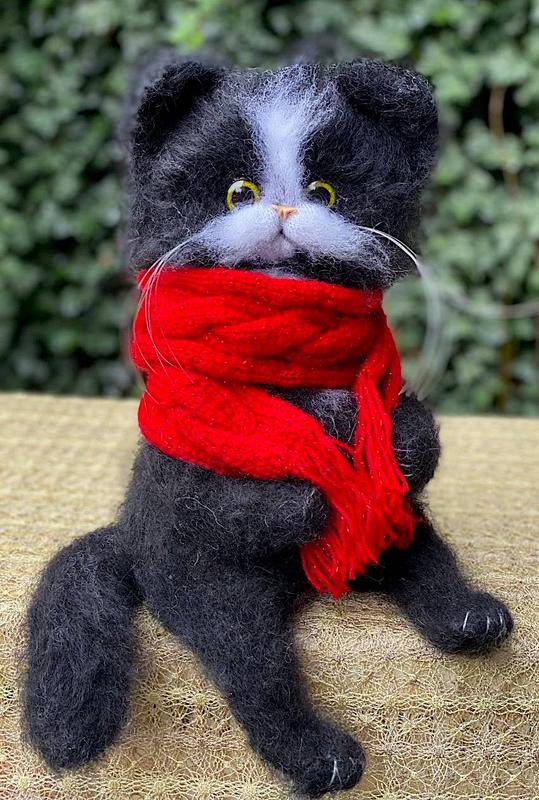 В свете свечей, отбрасывающих причудливые тени на стену, сидит он – таинственный черный кот в теплом вязаном красном шарфе. Его зеленые глаза мерцают, отражая огоньки, словно звезды в ночном небе. Шерсть его мягкая и гладкая, как бархат. Кот выглядит как настоящий маэстро, готовый начать свой сольный концерт. Его движения плавные и грациозные. Он будто бы понимает все тайны мира и знает ответы на все вопросы. Этот загадочный персонаж завораживает своей красотой и магией, заставляя забыть обо всем вокруг .Высота игрушки около 35 см. Шарф в комплекте. Игрушка связана из натуральной шерсти, наполнитель синтепух, внутри игрушки проходит медный каркас, что позволяет придать ей любое желаемое положение в пространстве, все части тела гнутся. Кот может стоять с помощью ног и хвоста.