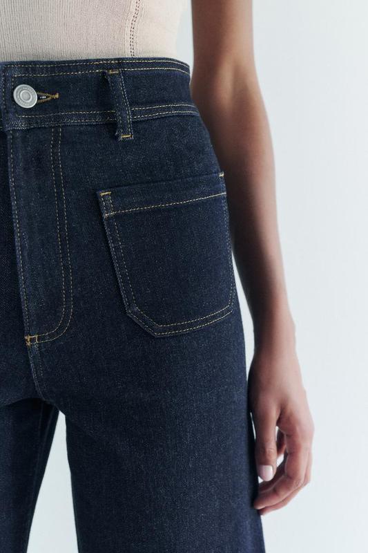 ВИСОКА ПОСАДКА - RELAXED LEG Джинсы с высокой посадкой, выполнены со смешанной штапельной тканью с хлопком. Петельки для ременя. Накладные карманы спереди и сзади. Застегиваются на молнию спереди и металлическую пуговицу спереди. 34размер