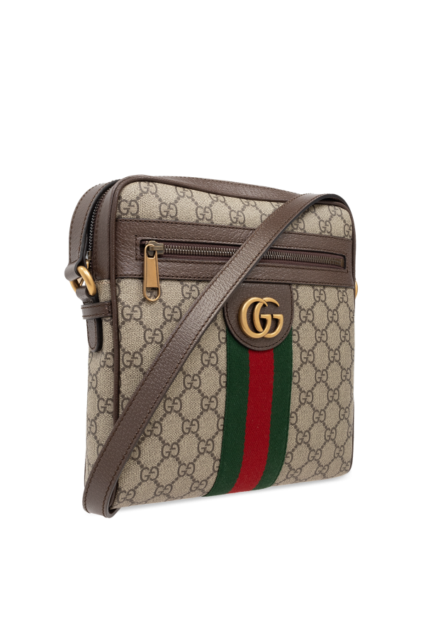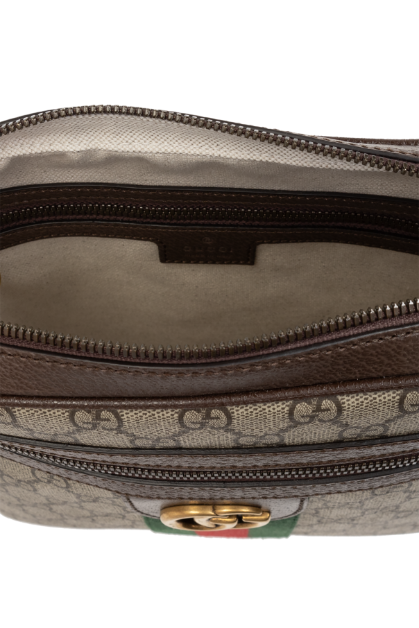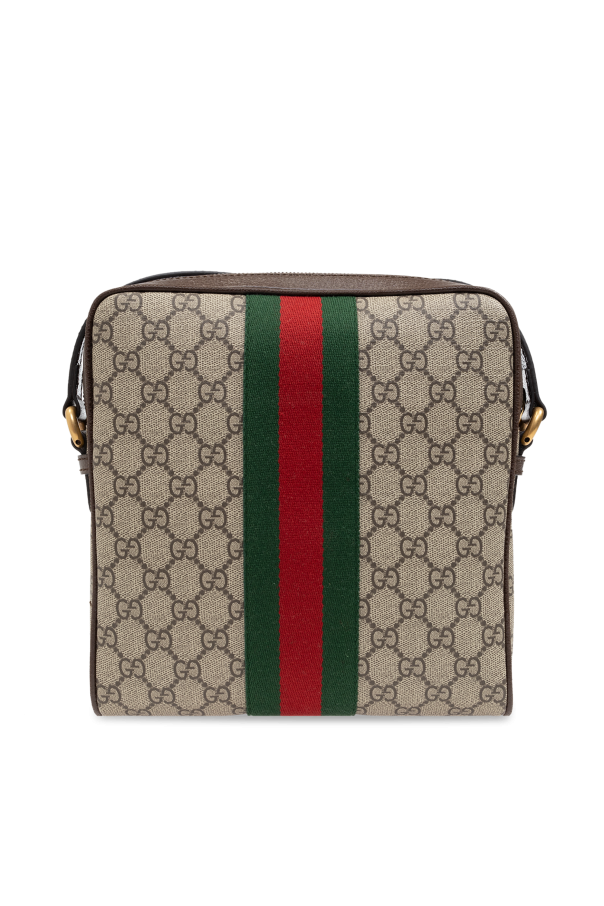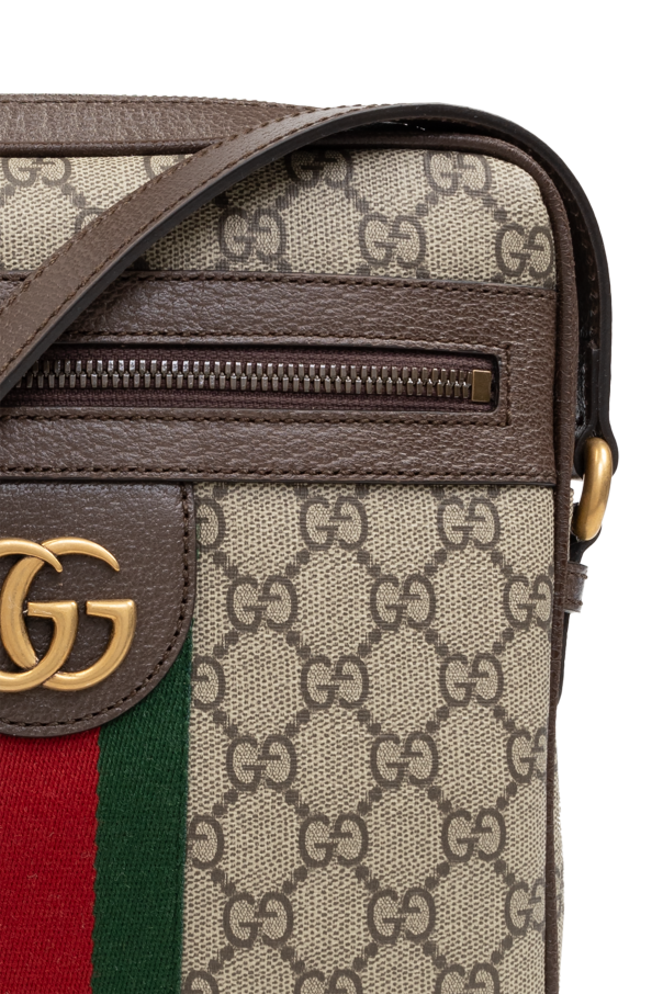Beige and brown \'Ophidia\' shoulder bag from Gucci. Made of \'GG Supreme\' canvas. Fastened with zip. Enriched by printed brown brand\'s logo and signature green-red-green \'Web\' stripe. Item also features metal logo detail and zip pocket at front, adjustable shoulder strap, antique fold-tone metal hardware and beige, lined interior which accommodates 1 compartment, 1 slip pocket and 1 zip pocket.