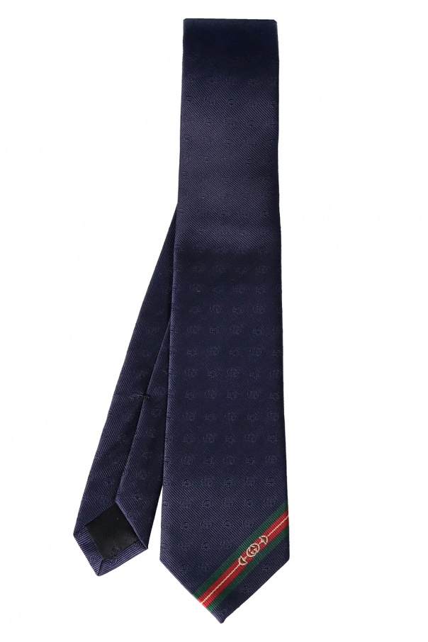 Navy blue tie from Gucci. Crafted from silk, this accessory is woven with a logo pattern accompanied by the label's iconic green-red-green ‘Web’ stripe.