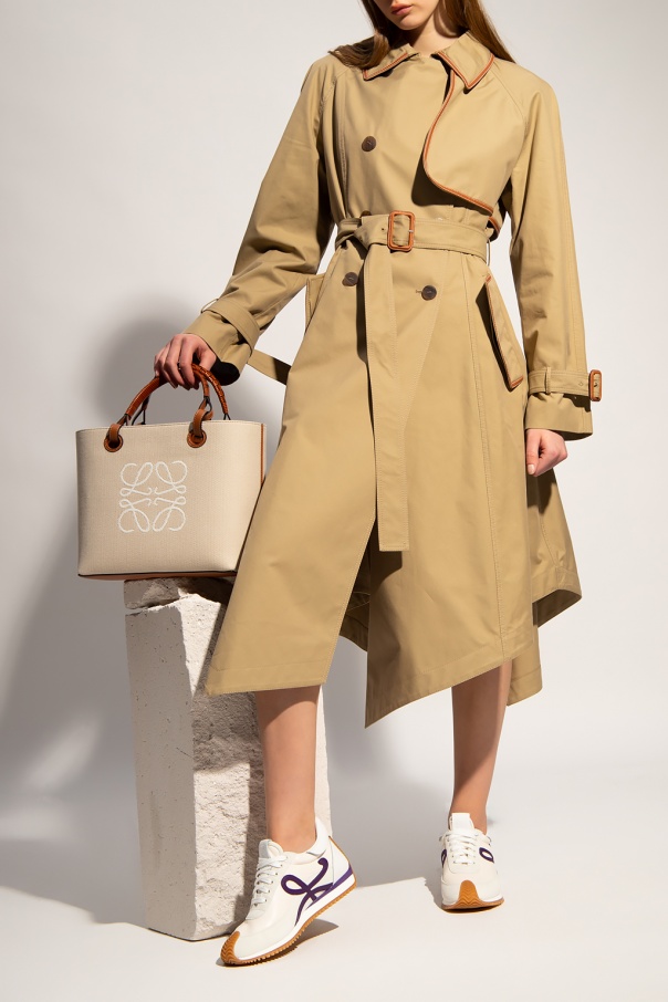 Beige trench coat with a collar from Loewe. Crafted from cotton with contrasting brown edges, this item fastens via buttons and features two flapped pockets with buttons and an attached buckle waist to cinch the waist.