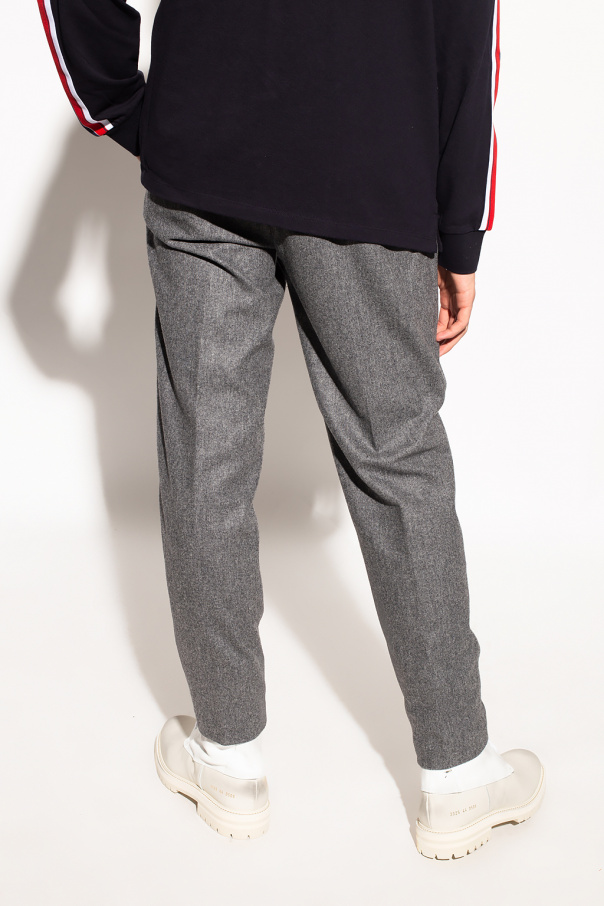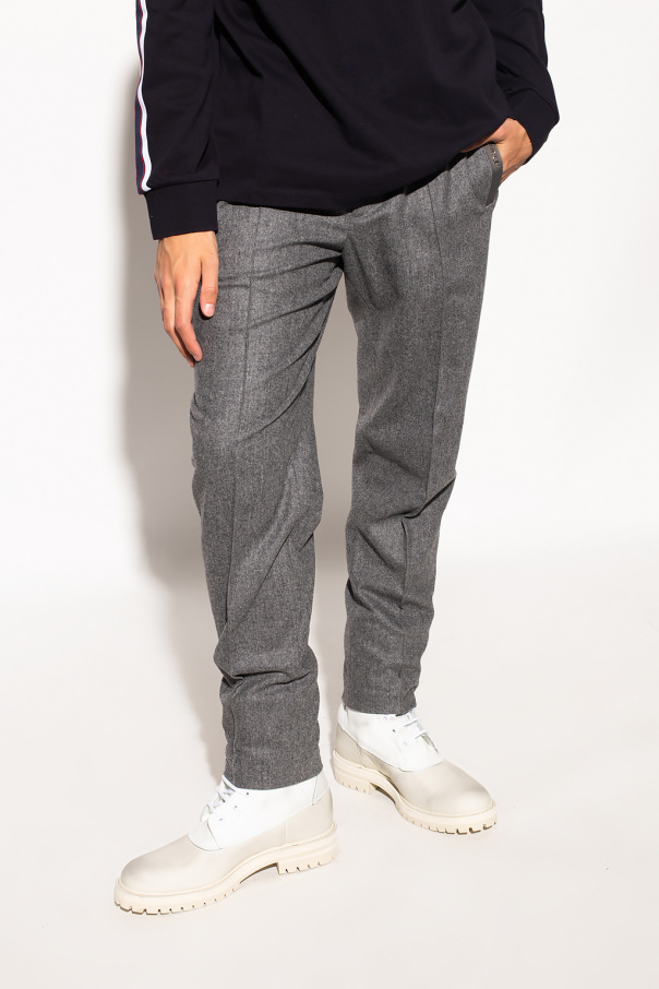 Grey trousers from Moncler. Made of wool, this pair falls down with tapered legs and is complete with a raised logo in silver-tone, two front pockets and two back pockets.