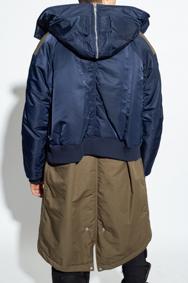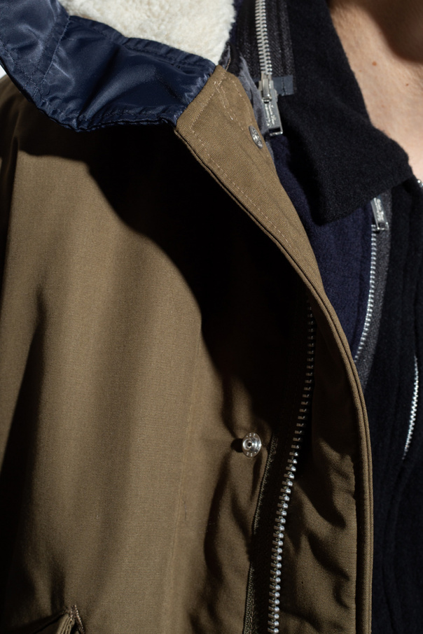 Green and navy blue parka from Undercover. Fastened with a zipper and snaps, this style features a drawcord-adjustable hood and waist, one slip pockets, two flapped pockets and a single back vent.