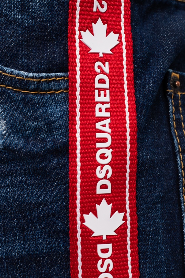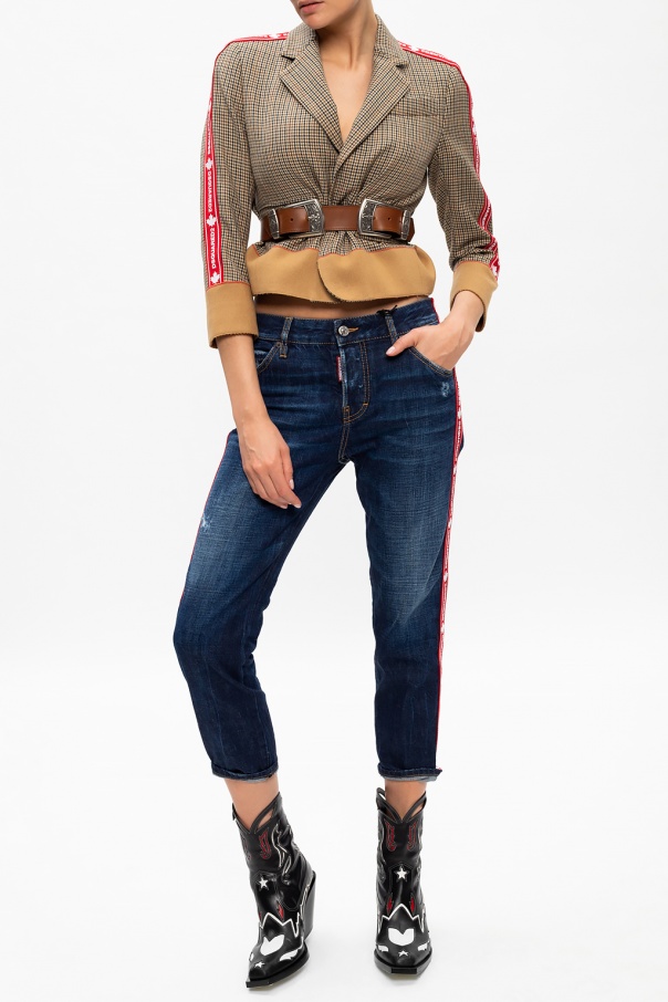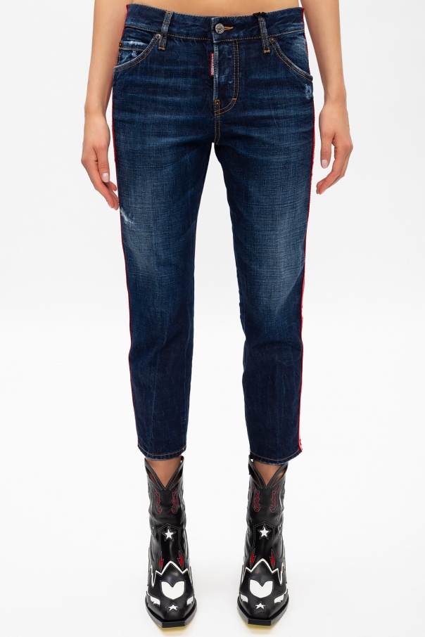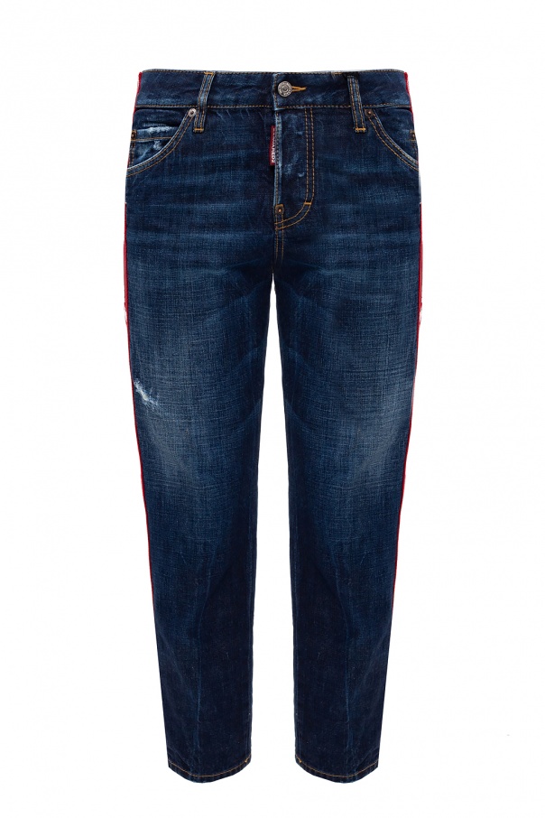 Navy ‘Cool Girl Cropped Jean’ distressed jeans from Dsquared2. Fastened with buttons. Decorated with red side stripes featuring a white logo. 3 slip pockets on the front, 2 at the back. Tapered legs.