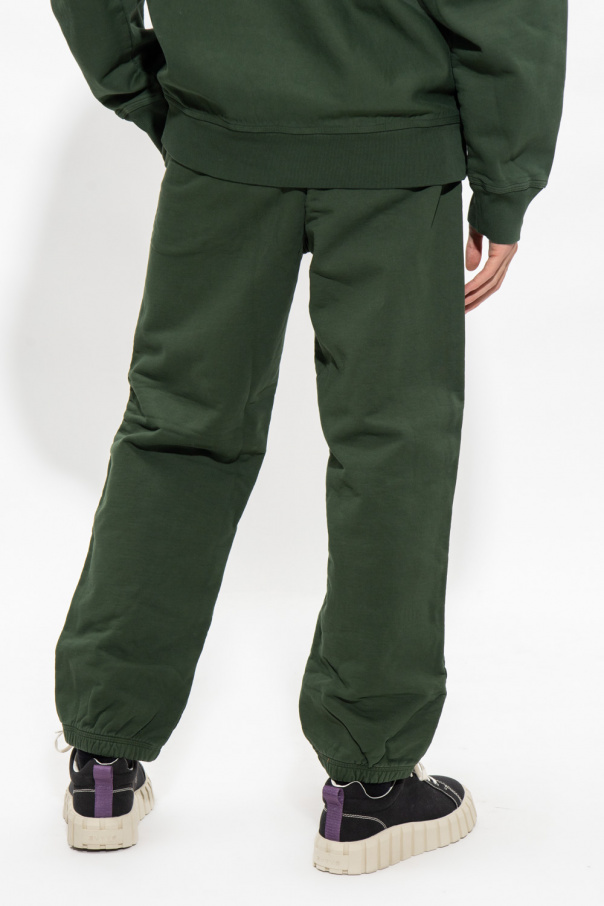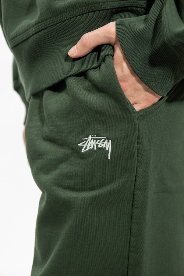 Green sweatpants from Stussy. Made of cotton, this pair is complete with an elastic drawstring waistband, embroidered logo pattern, four slip pocket and ribbed cuffs.