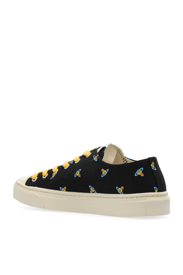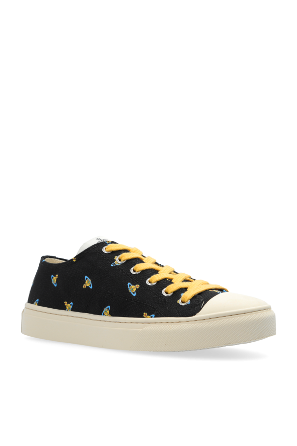 Introducing the exquisite Plimsoll Low Top 2.0 sneakers, an exclusive masterpiece from the renowned designer Vivienne Westwood. These black low-top sneakers are adorned with small, colorful motifs reminiscent of the designer\'s iconic logo, evenly dispersed across the textile surface. Crafted from premium textile material, these shoes feature a contrasting cream/white rubber sole, adding a touch of sophistication. The vibrant yellow laces inject a pop of color, creating a striking contrast against the black upper. An additional pair of laces is included for versatility. Intricate details include a designer label on the tongue and an insole printed with the designer\'s logo, ensuring every step exudes style. The reinforced toe in a lighter material enhances the classic look while providing durability. Why Choose This Product? Designed by the iconic Vivienne Westwood, a pioneer of punk fashion. Premium quality textile and rubber materials for comfort and durability. Unique and colorful motifs that add a touch of exclusivity. Contrasting yellow laces and additional interchangeable laces included. Reinforced toe for added durability and classic appeal.