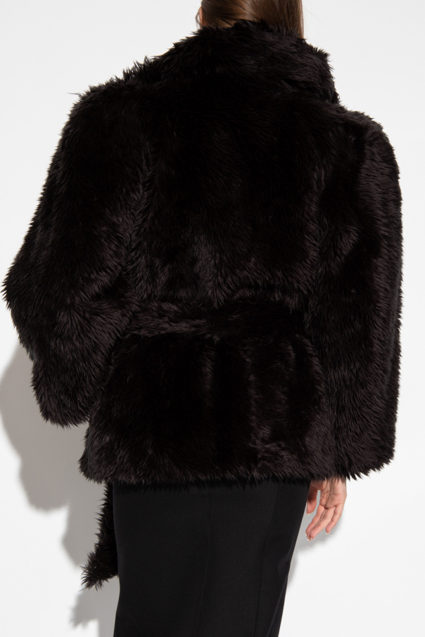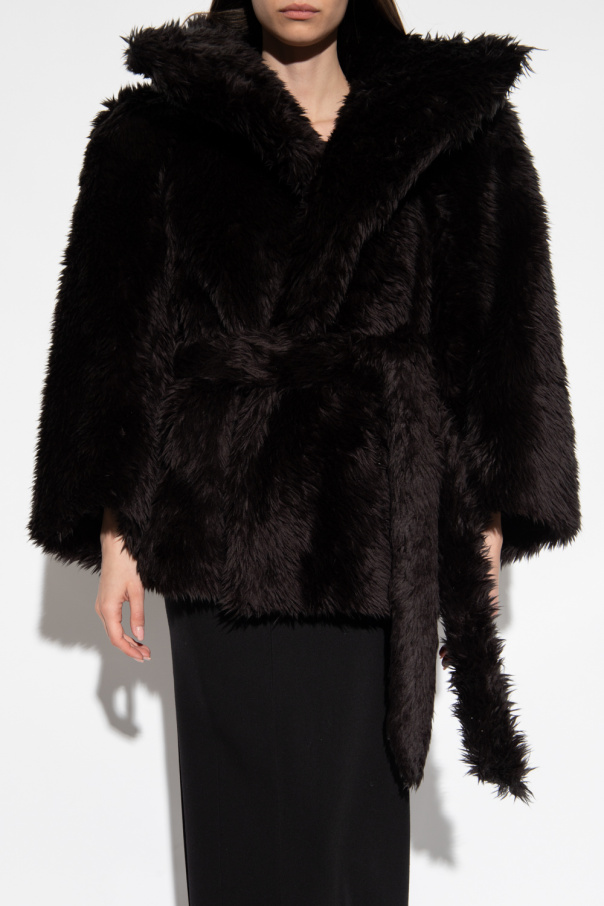 Black jacket from Balenciaga. Crafted from faux-fur, this style is cinched with a belt at the waist and detailed with a high-neck collar, underwiring, two slip pockets and long sleeves.