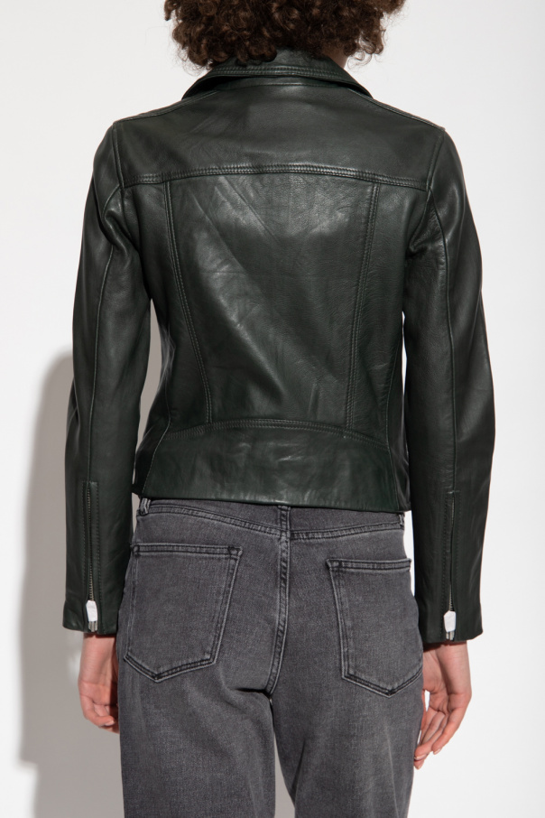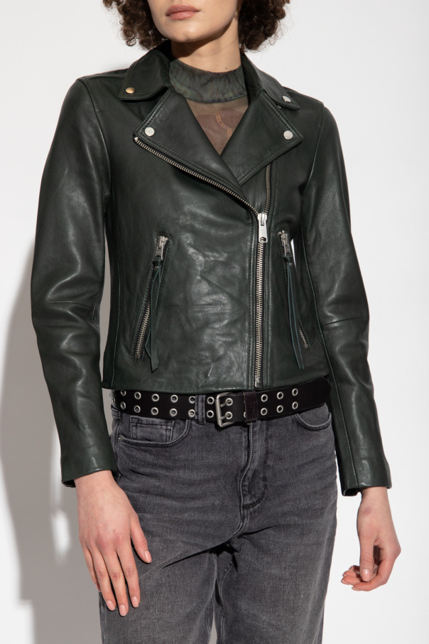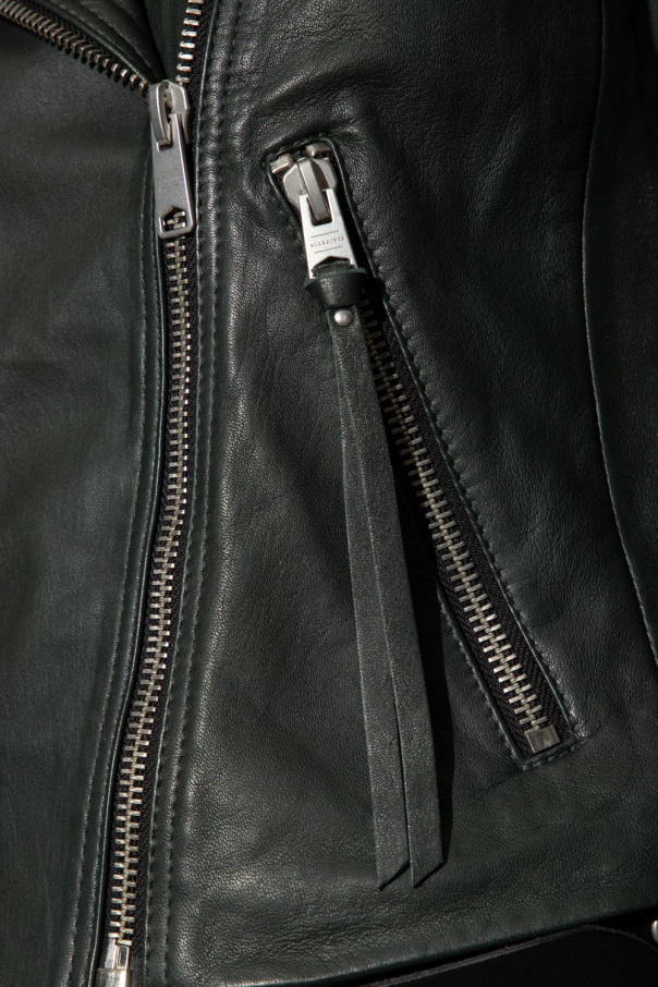 Dark green ‘Dalby’ jacket from AllSaints. Crafted from lamb leather, this garment features two front pockets, long sleeves with zips and notch lapels with snap-fastenings.