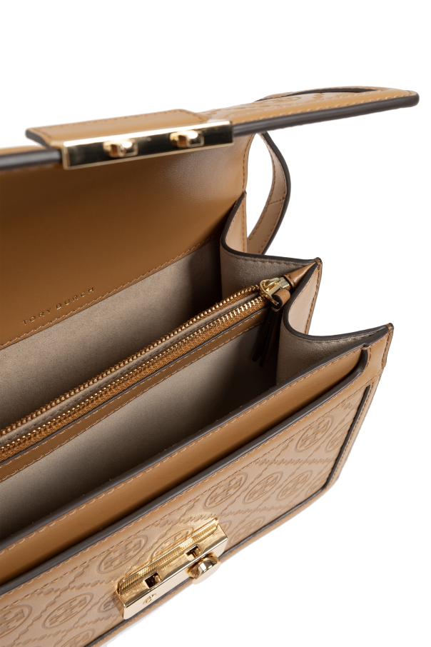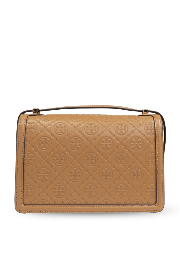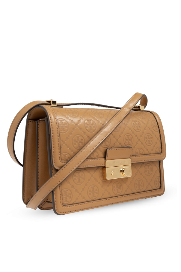 Introducing the T-Monogram Shoulder Bag by Tory Burch, a masterpiece of luxury and sophistication. This exquisite accessory, rendered in an elegant brown hue, features a distinctive rectangular shape with rounded corners, making it both timeless and contemporary. Crafted from premium leather, the bag boasts an all-over embossed monogram pattern, characteristic of the T-Monogram collection. The meticulous craftsmanship is evident in the carefully stitched edges, ensuring durability and a refined finish. The centerpiece of the design is a gold-toned, metal turn-lock closure on the front flap, adding a touch of opulence and security. The adjustable shoulder strap provides versatility, allowing you to tailor the length to your preference. Inside, the bag is thoughtfully designed with two separate compartments, a zipped pocket, and a slip pocket, offering ample space for your essentials while maintaining an organized appearance. The Tory Burch logo is subtly embossed, reinforcing the brand\'s identity and commitment to quality. Perfect for daily use or special occasions, this shoulder bag is a testament to Tory Burch’s dedication to timeless elegance and functional design. Why Choose This Product? Exquisite Design: Features a sophisticated monogram pattern and luxurious gold-toned hardware. High-Quality Material: Constructed from premium leather for durability and a refined look. Versatile Functionality: Adjustable strap and multiple compartments for convenience and style. Iconic Brand: Represents the timeless elegance and innovative design of Tory Burch.
