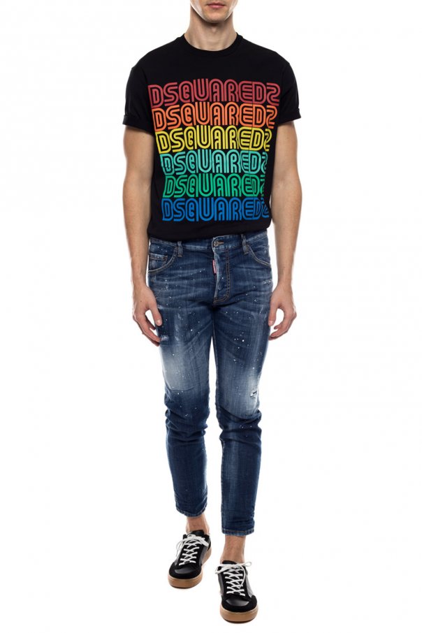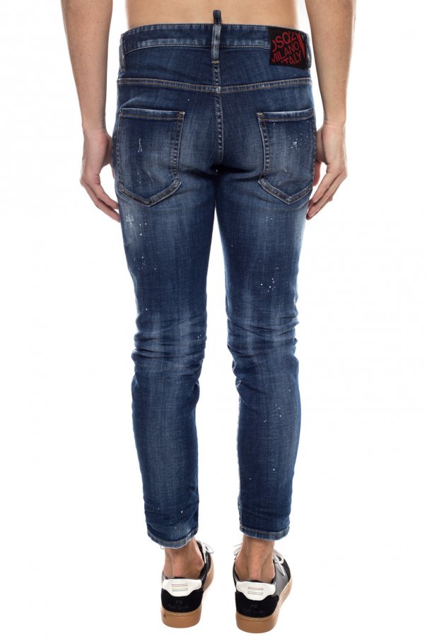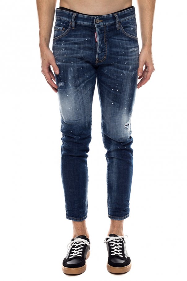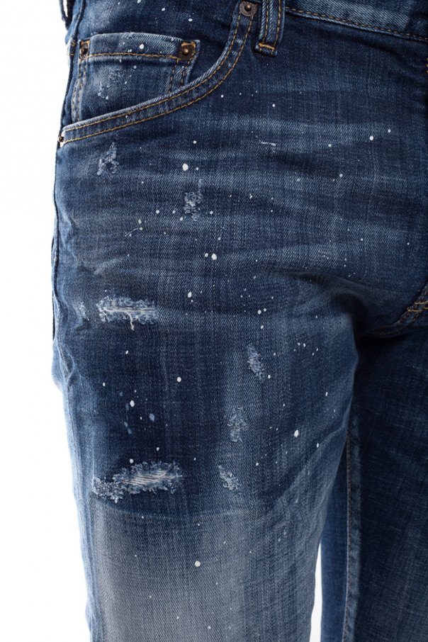 Blue ‘Skater Jean’ jeans with a raw trim from Dsquared2. Button fastening. Decorated with a white paint splatter print and a patch in black and red. Two slip pockets on the front and at the back. Tapered legs.