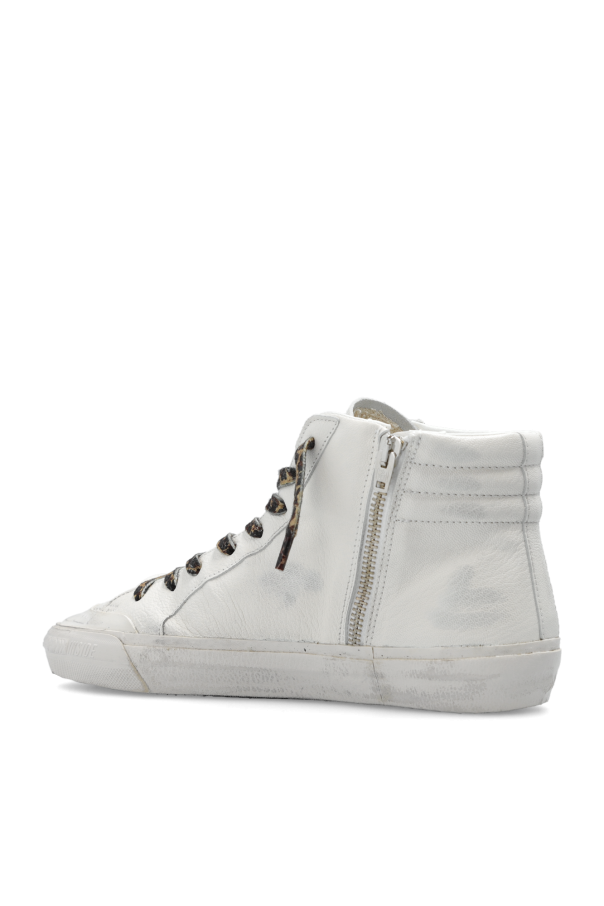 Cream ‘Slide’ high-top sneakers from Golden Goose. Made of leather, this lace-up model sits on a cream and black rubber sole and showcases a gold-tone logo print, glossy appliqués, animal-printed shoelaces as well as a beige star patch and a side zipper.