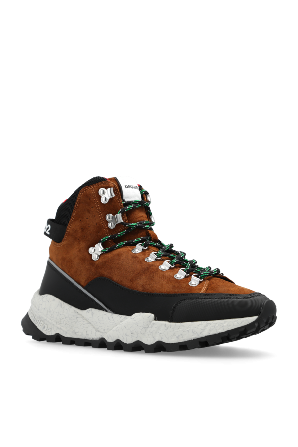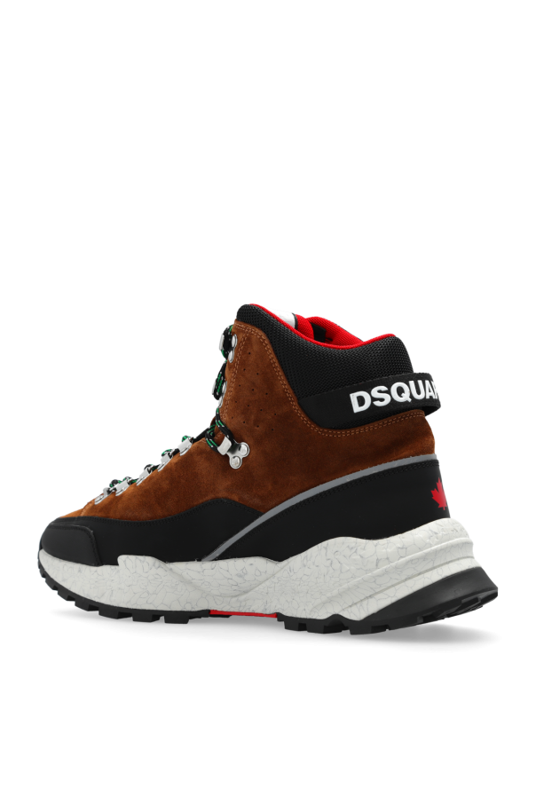 Brown and black ‘Free’ boots from Dsquared2. Crafted from leather and fabric, this lace-up pair sits on a black and red rubber sole and is decorated with a logo pattern in white.