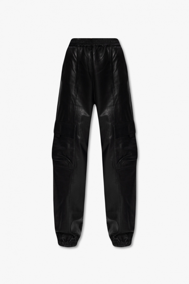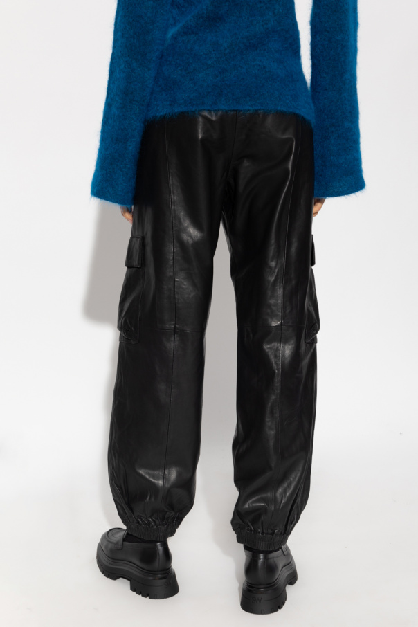 Black ‘KallieGZ’ cargo trousers from Gestuz. Crafted from lamb leather with the LWG certificate, this pair features an elasticated waistband, two slip pockets, two flapped pockets and elasticated cuffs.