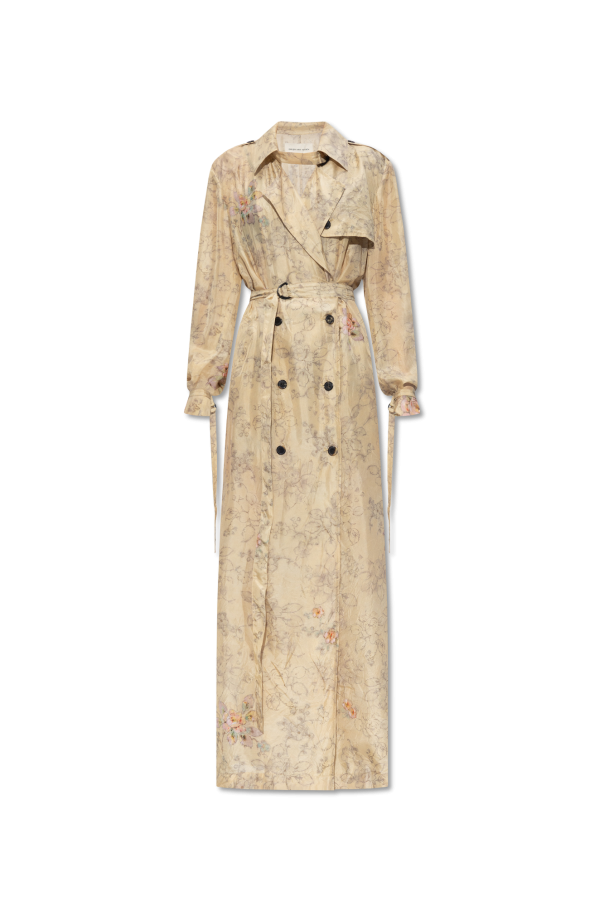 Beige trench coat from Dries Van Noten. Made from silk, this style fastens with buttons and showcases a pattern with flowers. It is complete with a single back vent, shoulder epaulettes, collar with a strap, a storm flap, two slip pockets, long sleeves with cuff straps and a waist-cinching belt.