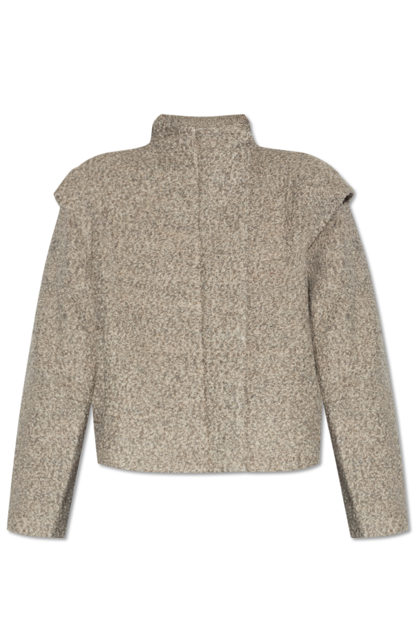 Cream and grey ‘Island’ jacket with a standing collar from Notes Du Nord. Enriched by pleats on the shoulders, this style fastens with a zip and hidden snaps and features two frontal pockets and long sleeves.