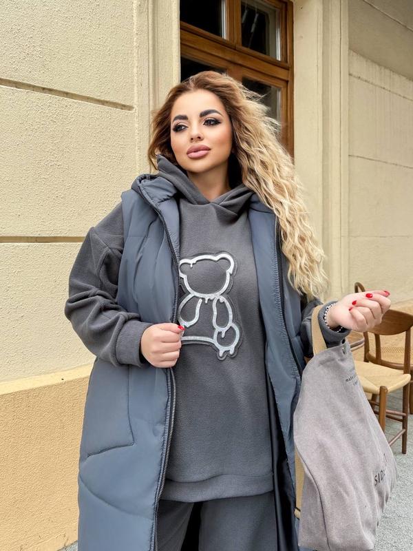 Тройка Жилет +костюм (мод 906+0802) Цена 2100грн Костюм «Ми-ми-мешка»(Тедди) Мод: 0802 Ткань: флис двухсторонний Цвет: молочный, черный, графит Размер: 50-52,54-56,58-60