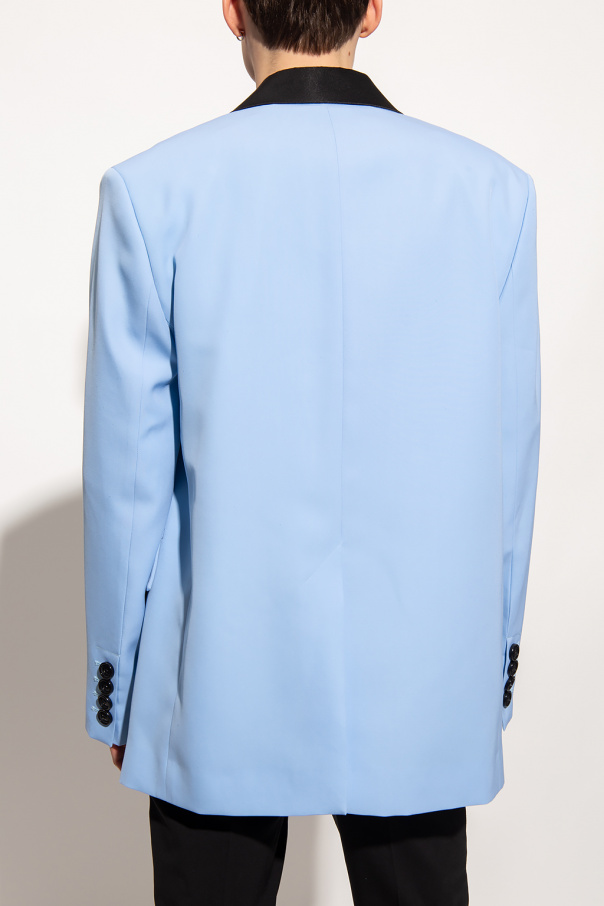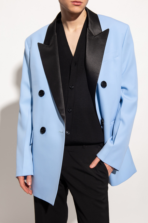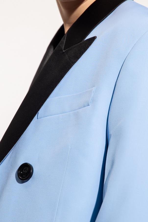 Light blue double-breasted blazer from Ami Alexandre Mattiussi. Crafted from wool, this garment features button fastenings, two flap pockets, one slip pocket, black peak lapels with a satin finish, single rear vent and button cuffs.