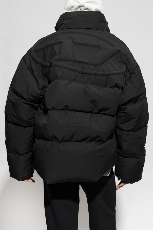 Black ‘W-OVAL’ quilted down jacket from Diesel. Fastened with a zip, this long sleeve design features an embroidered logo pattern at the back, two snap-fastened pockets and drawstring hem.