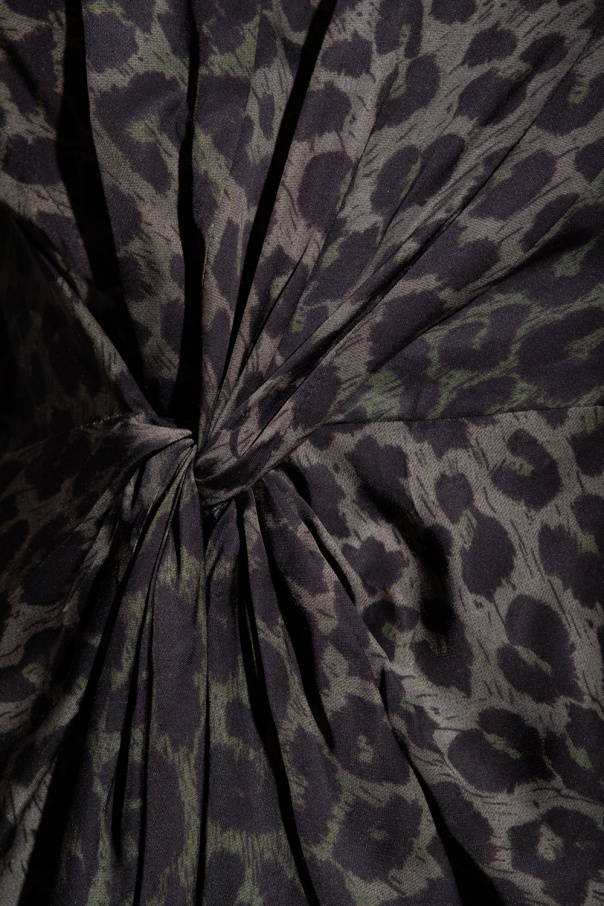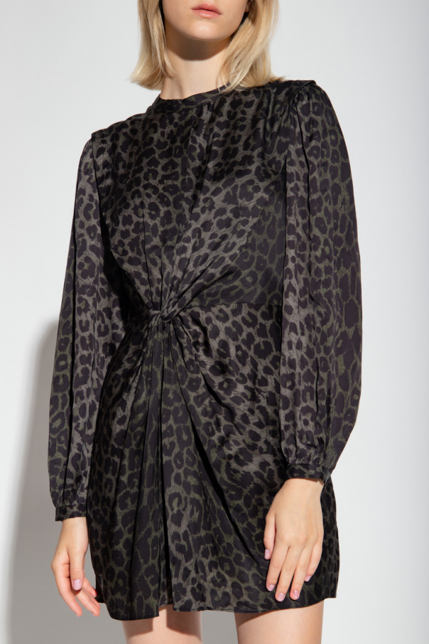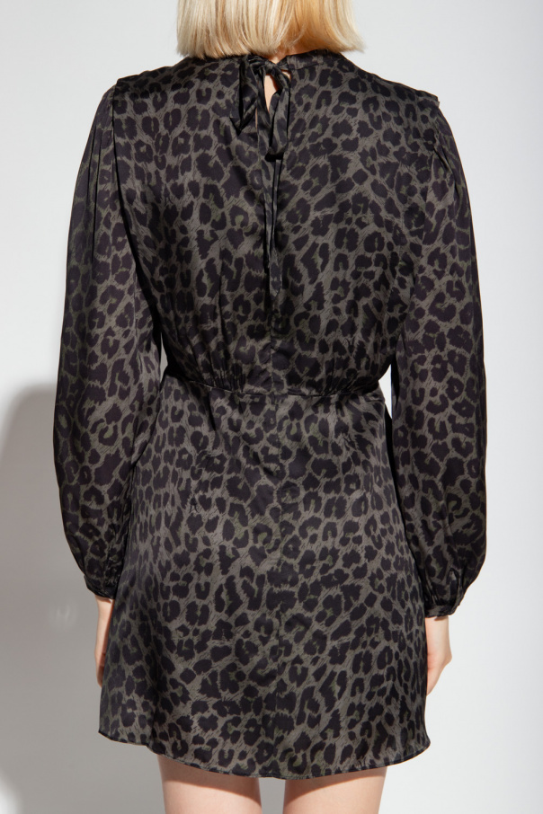 Dark green ‘Jemima’ mini dress from AllSaints. Crafted from satin with a black animal pattern, this design features a concealed back zip with a hook, decorative tie at the nape of the neck, decorative draped front, round neck with trimming and long puff sleeves with buttoned cuffs.