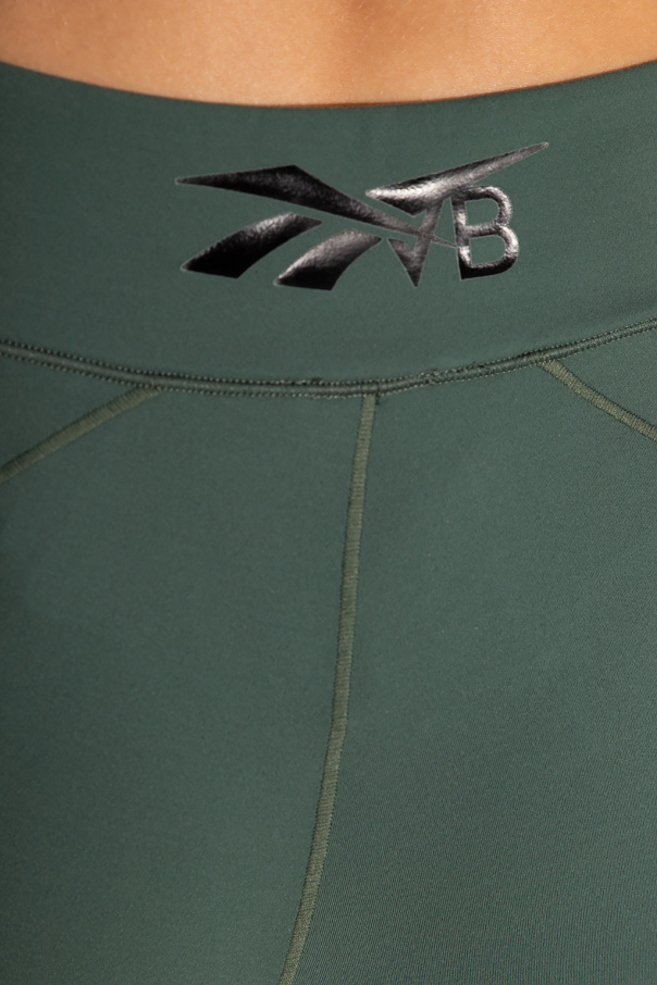 Green leggings from Reebok x Victoria Beckham. Decorated with a black logo embroidery, this pair is complete with an elastic waistband and has 3/4 length legs.