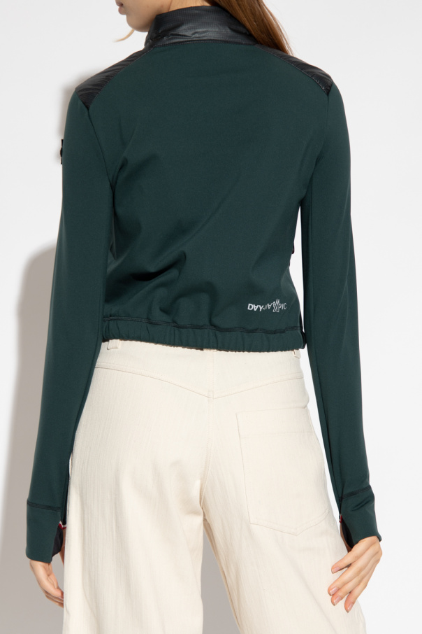 Dark green insulated sweatshirt from Moncler Grenoble, the ’Moncler Grenoble Day-Namic’ collection. Made of technical and ripstop fabric, this garment features a waterproof zip, quilted front padded with goose down and feathers, sleeve patch with a logo, reflective logo at the back, black \'#Moncler’ logo with rubber trims on one sleeve, two pockets with concealed zips, snap-fastened stand collar with a reinforced back, drawstrings hem and long sleeves with thumb holes and stripe in navy, white and red.