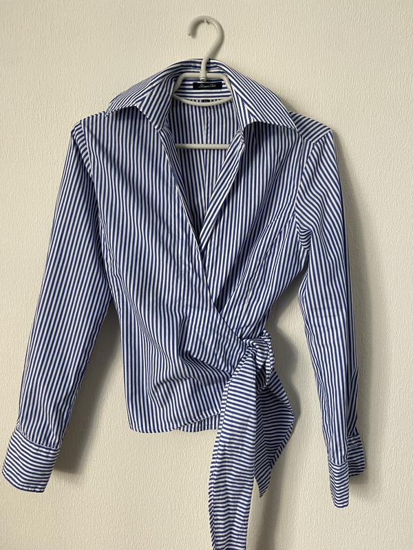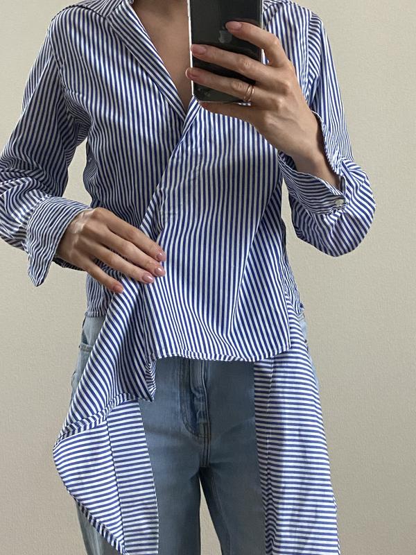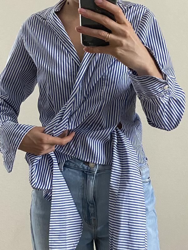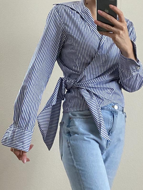 Интересная рубашка бело-синего цвета в полоску, на запах. Гармонично соединится с джинсами любого цвета, классическими брюками (типа карго) или юбкой. Приятная, натуральная ткань. Производитель указывает размер XS, однако скорее подойдет на S-M. Можно корректировать ширину «под себя» за счет регулировки пояса. Длина 55 см Длина рукава от плеча 61см Ширина плечей 42 см Ширина снизу и на талии регулируется Мои параметры Рост 170см: Обхват бедер - 95см Обхват груди- 85см Обхват талии - 67 см