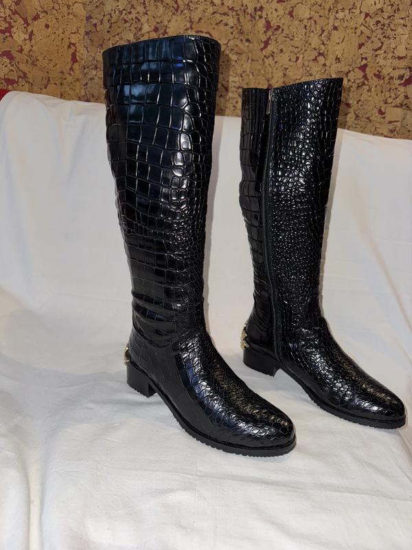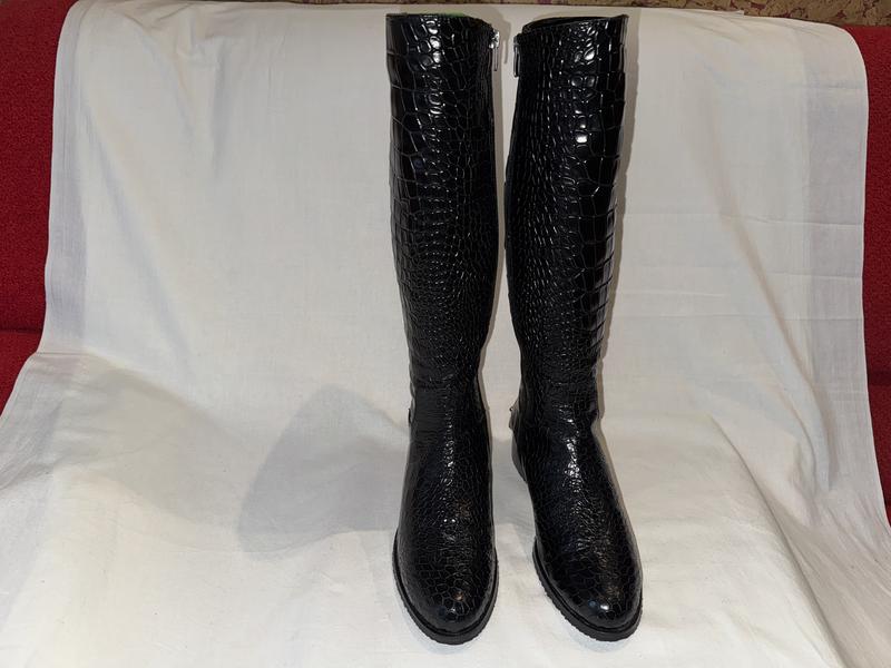 Из собственного гардероба!!!!! Вашему вниманию сапожки из натуральной вытесненной кожи под рептилию, + натуральный мех снизу и искусственный мех по холвару, оригинальность придаёт брошка со стразами. Новые. Привезла из Эмиратов, платила 100 дол. Ширина стельки внутри - 8.5 см. Высота холявки от низа каблука - 43см. Объем холёвки по верху - 38 см. Высота каблука -4см. Вникнут вопрос - запрашивайте! НЕ ПРОПУСТІТЬ ! Удачного и приятного Вам выбора!