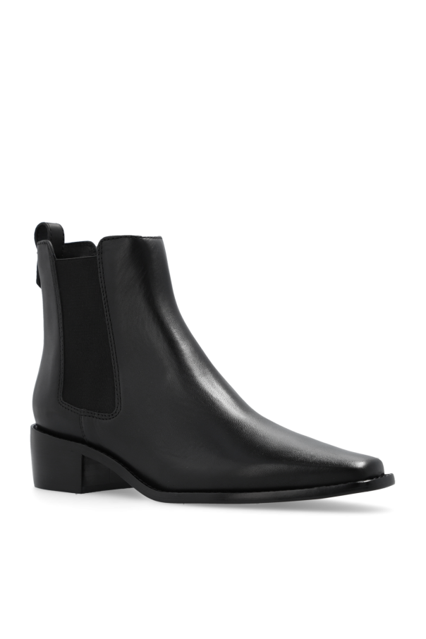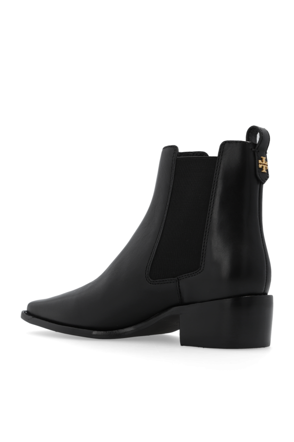 Black heeled ankle boots from Tory Burch. Made from calf leather, this model sits on a black sole in leather and rubber and features a gold-tone metal logo plaque at the back and elastic panels on the sides.
