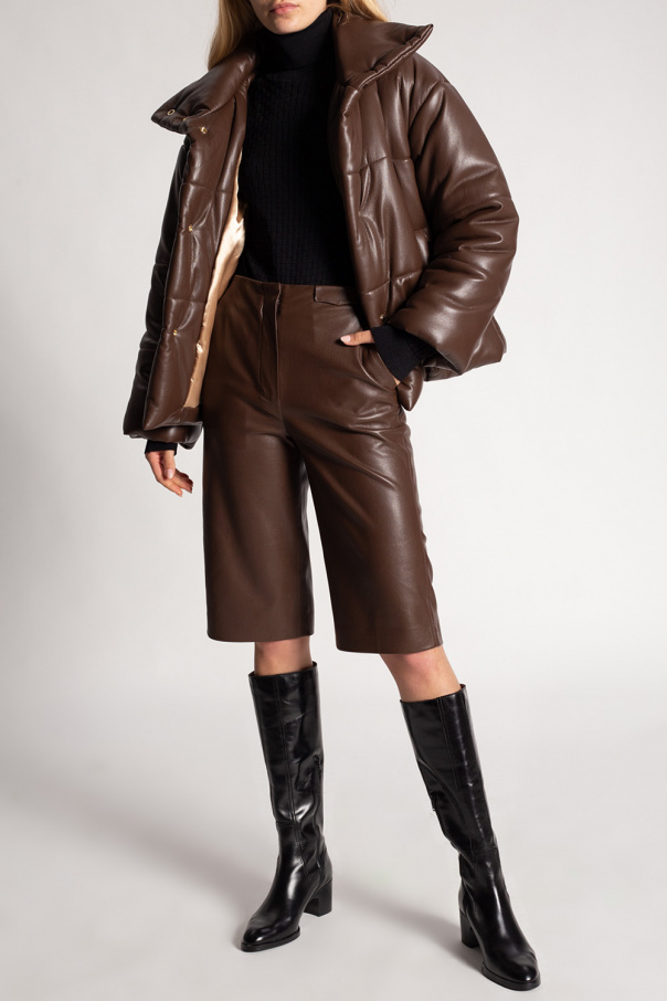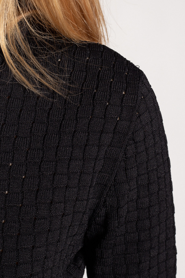 Black bodysuit from Nanushka. Crafted from a ribbed knit, this long-sleeved design showcases decorative cut-outs and elasticized trims on the standing collar and cuffs.