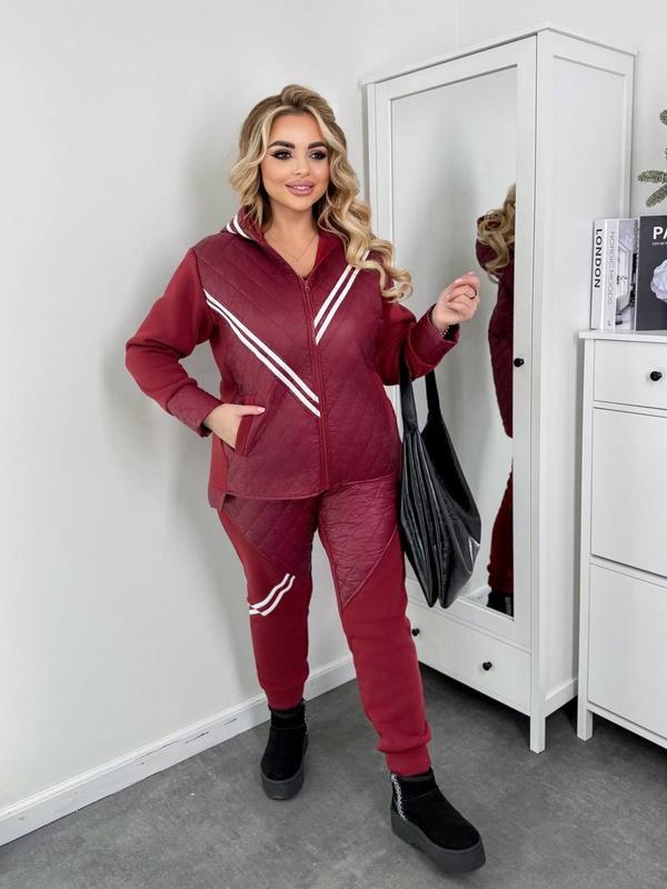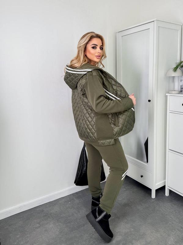 Костюм -двойка Размеры : 50-52,54-56,58-60,62-64,66-68 Цвета: капучино, хаки, черный, бордо, шоколад Ткань : трехнитка, плащевка Лаке, синтепон 100, подкладка простегана к основанию Стеганный костюм-двойка: куртка на молнии в цвет основы, глубокий капюшон, на рукавах широкие манжеты из плащевки. Брюки : широкая резинка, высокая посадка, по бокам два кармана, по низу манжеты из трехнитки. Куртка и брюки украшены черно-белым лампасом : на груди, брюках и капюшоне. Замеры модели-балталл Инны ОГ100, ОТ88, ОБ112, рост 165см, на ней одет размер 50-52 Замеры изделия по верхнему шву: Размер 50-52: Курточка: Объем груди 124 Объем талии 124 Объем бёдер 124 Длина рукава 56 Длина по спинке 72 Штани: Объем талии 76-92 Объем бёдер 116-122 Длина по внешнему шву 103 Длина по внутреннему шву 73 Стегно 68 Колено 52 Размер 54-56: Курточка: Объем груди 132 Объем талии 132 Объем бёдер 132 Длина рукава 60 Длина по спинке 76 Плечи 50 Штани: Объем талии 86-102 Объем бёдер 128-136 Длина по внешнему шву 106 Длина по внутреннему шву 76 Стегно 74 Колено 56 Размер 58-60: Курточка: Объем груди 140 Объем талии 140 Обʼєм стегон 140 Длина рукава 61 Длина по спинке 76 Плечи 51 Штани: Объем талии 94-114 Объем бёдер 138-146 Длина по внешнему шву 106 Длина по внутреннему шву 73 Стегно 78 Колено 58 Размер 62-64: Курточка: Объем груди 148 Объем талии 148 Объем бёдер 148 Длина рукава 62 Длина по спинке 77 Плечи 52 Штани: Объем талии 98-118 Объем бёдер 144-148 Длина по внешнему шву 106 Длина по внутреннему шву 73 Стегно 84 Колено 62 Размер 66-68: Курточка: Объем груди 154 Объем талии 154 Объем бёдер 154 Длина рукава 62 Длина по спинке 77 Плечи 54 Штани: Объем талии 108-128 Обʼєм стегон 152-156 Длина по внешнему шву 106 Длина по внутреннему шву 73 Стегно 86 Колено 66 Модель 19001VL