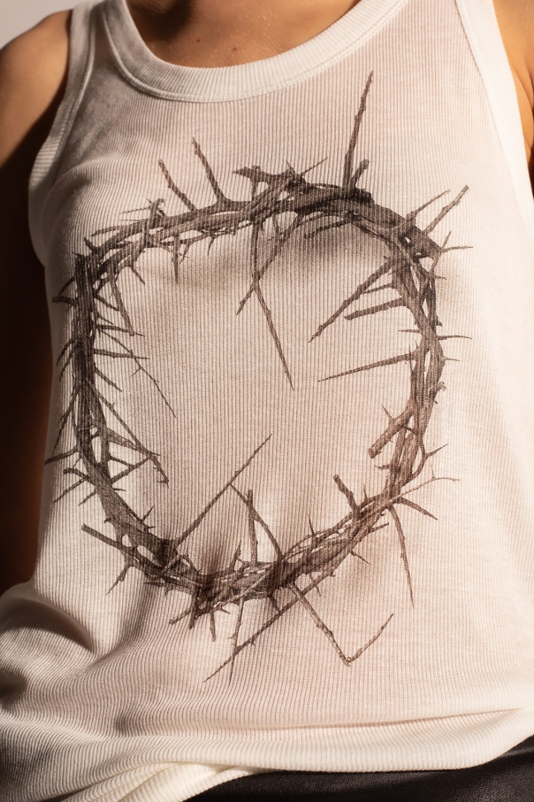 Cream sleeveless crewneck T-shirt from Ann Demeulemeester. Made of cotton, this garment is enriched by a black print, side slits and raw edges.